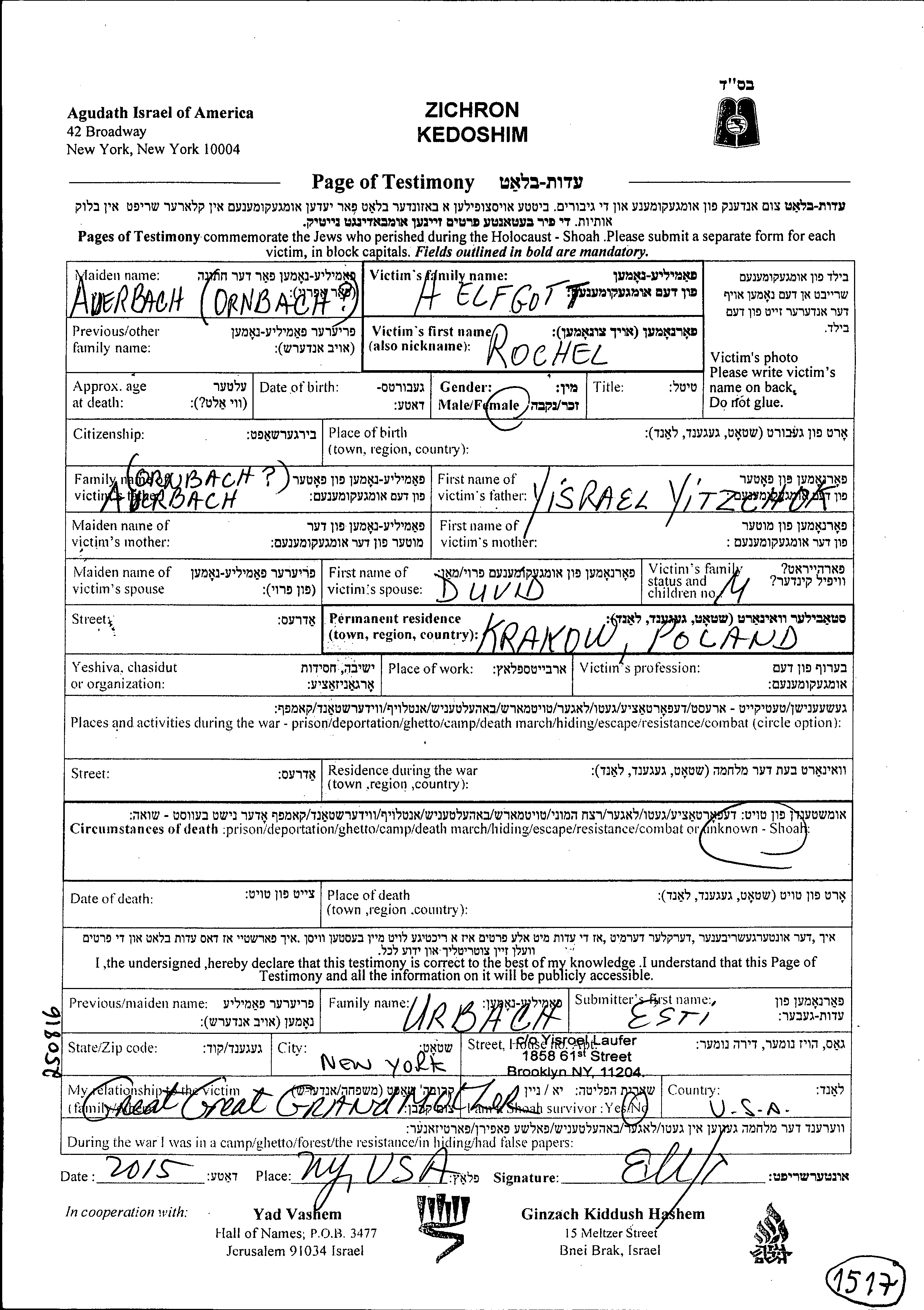 Helfgott | Rochel | Krakow, Pologne | Feuille de témoignage | |
