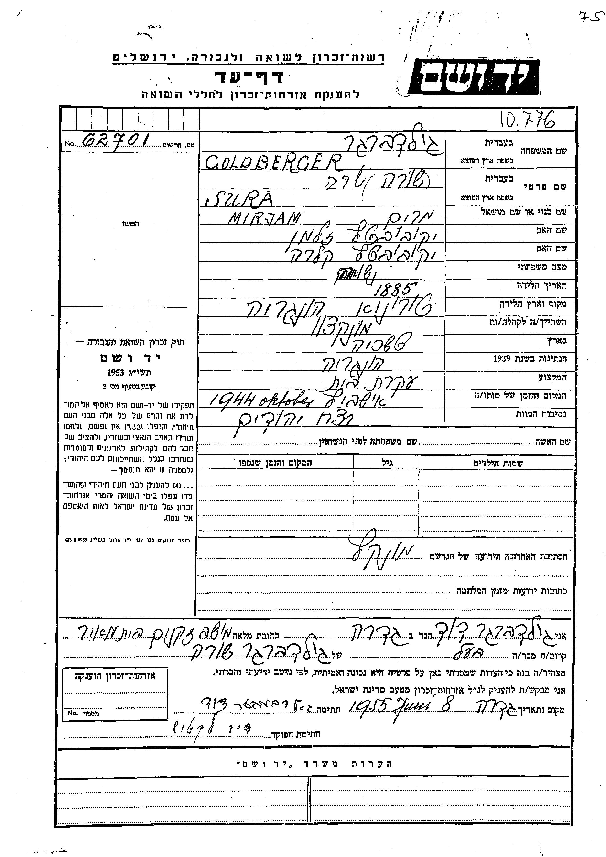 Goldberger | Sura Mirjam | 1885 | Munkacs, Tchécoslovaquie | Feuille de témoignage |