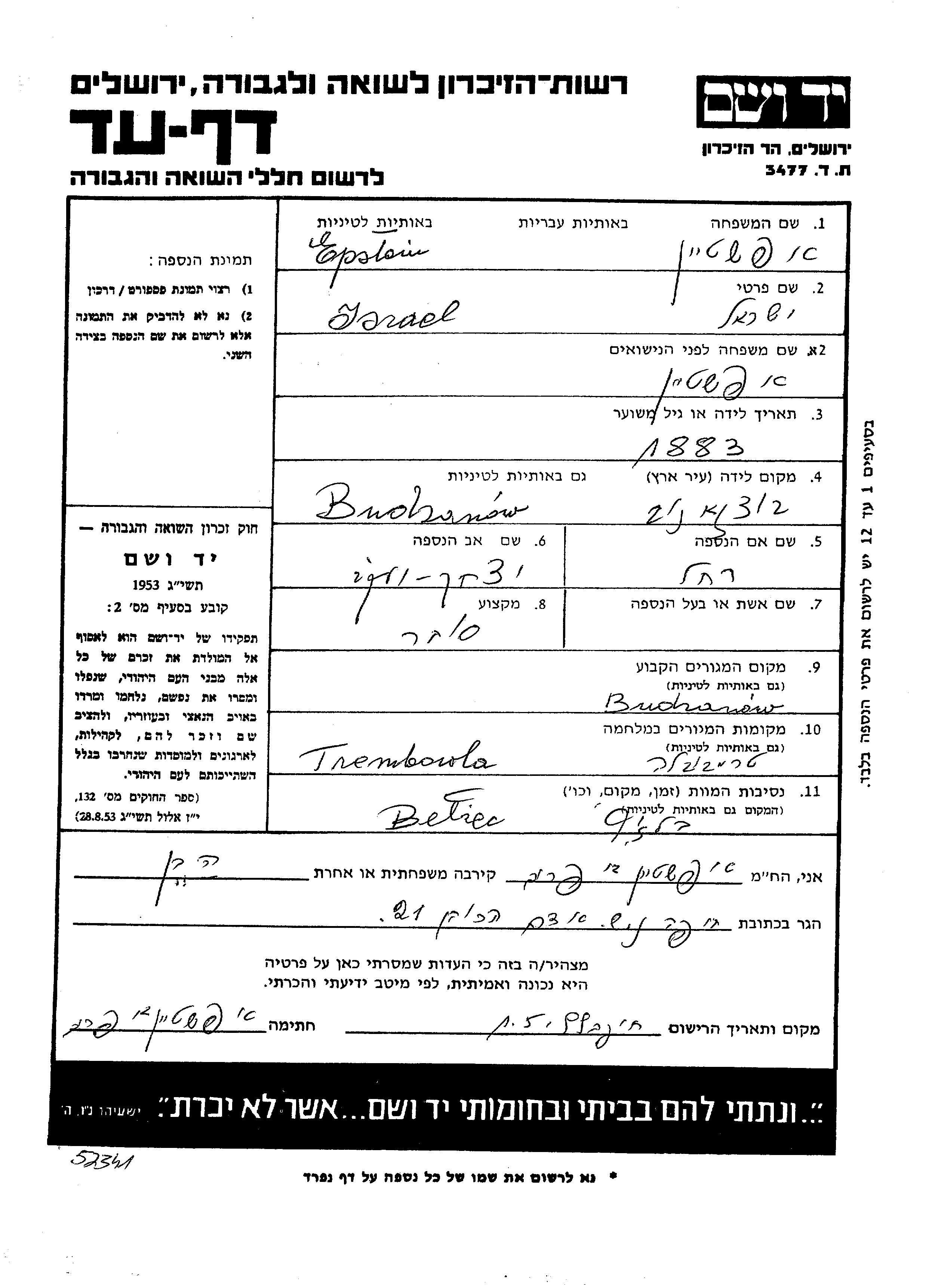 Epstain | Israel | 1883 | Budzanow, Pologne | Feuille de témoignage |