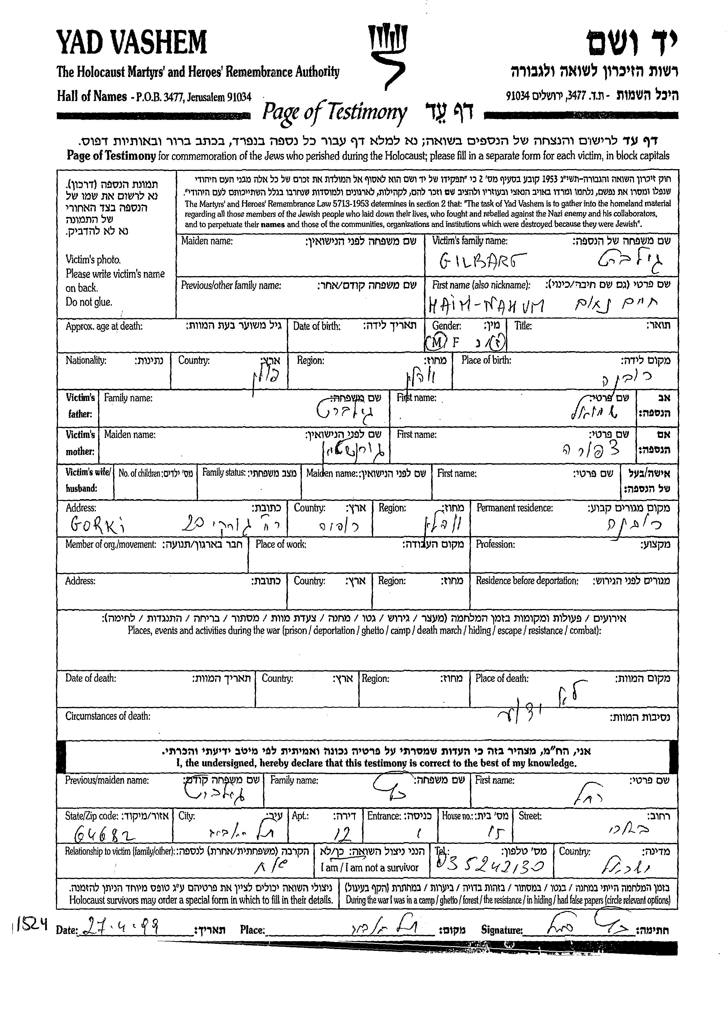 Yad Vashem - Pages of Testimony Names Memorial Collection