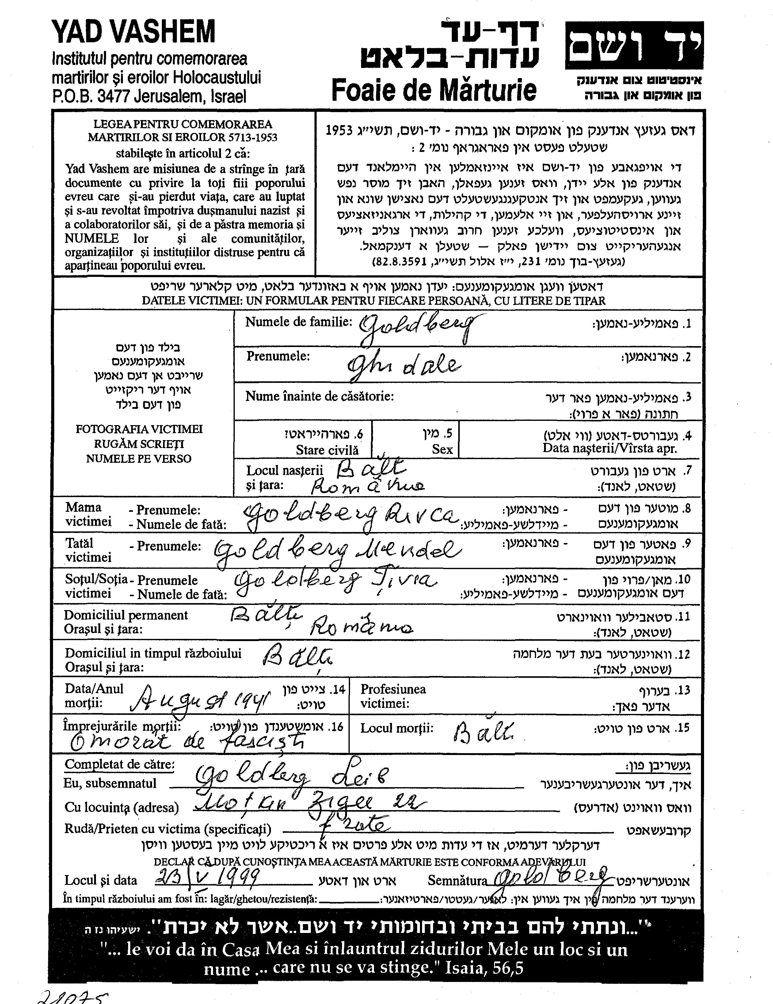 Goldberg | Ghidale | Bălți, Roumanie | Feuille de témoignage | |
