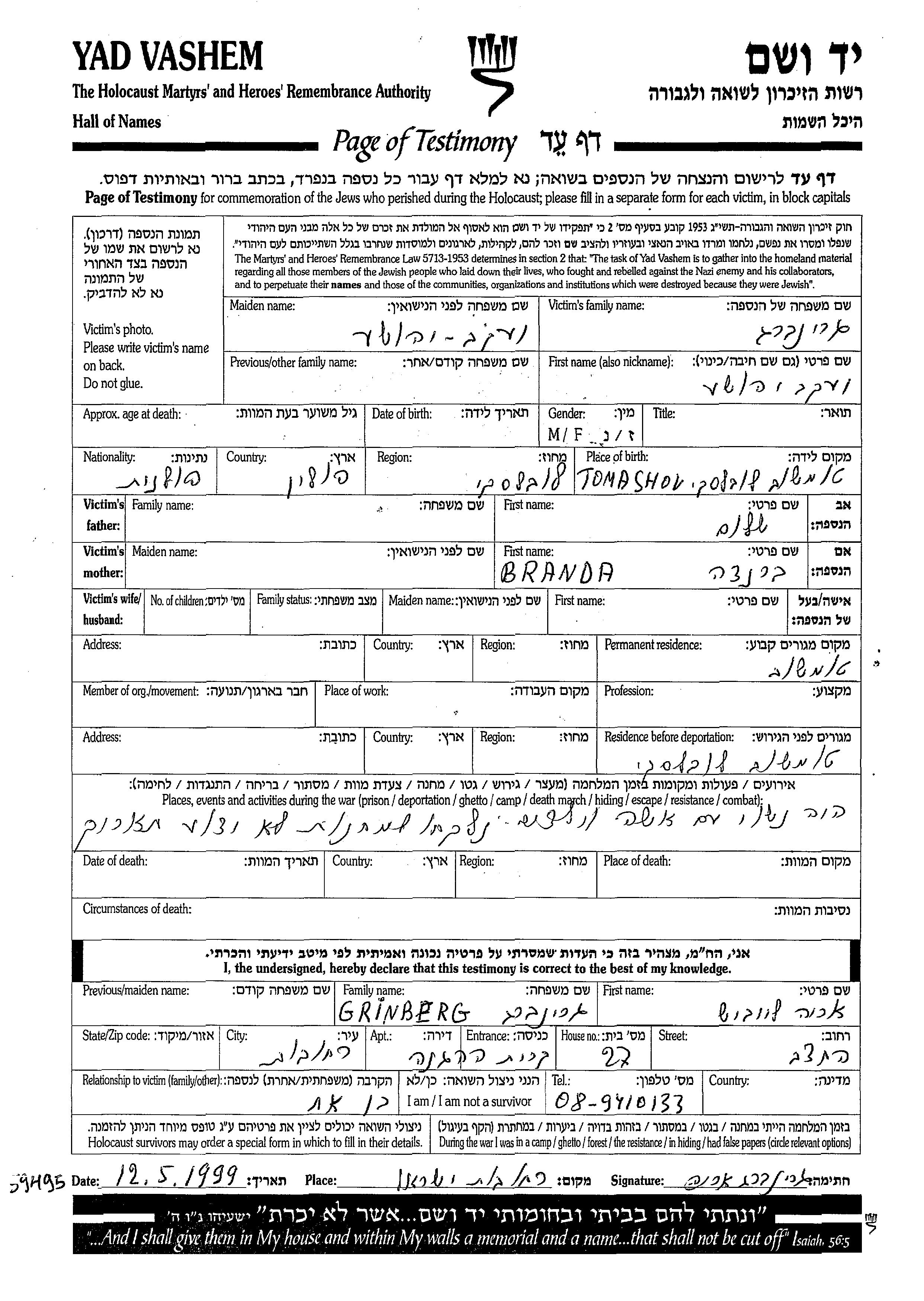 Grinberg | Yaakov Yehoshua | Tomashov, Pologne | Feuille de témoignage | |