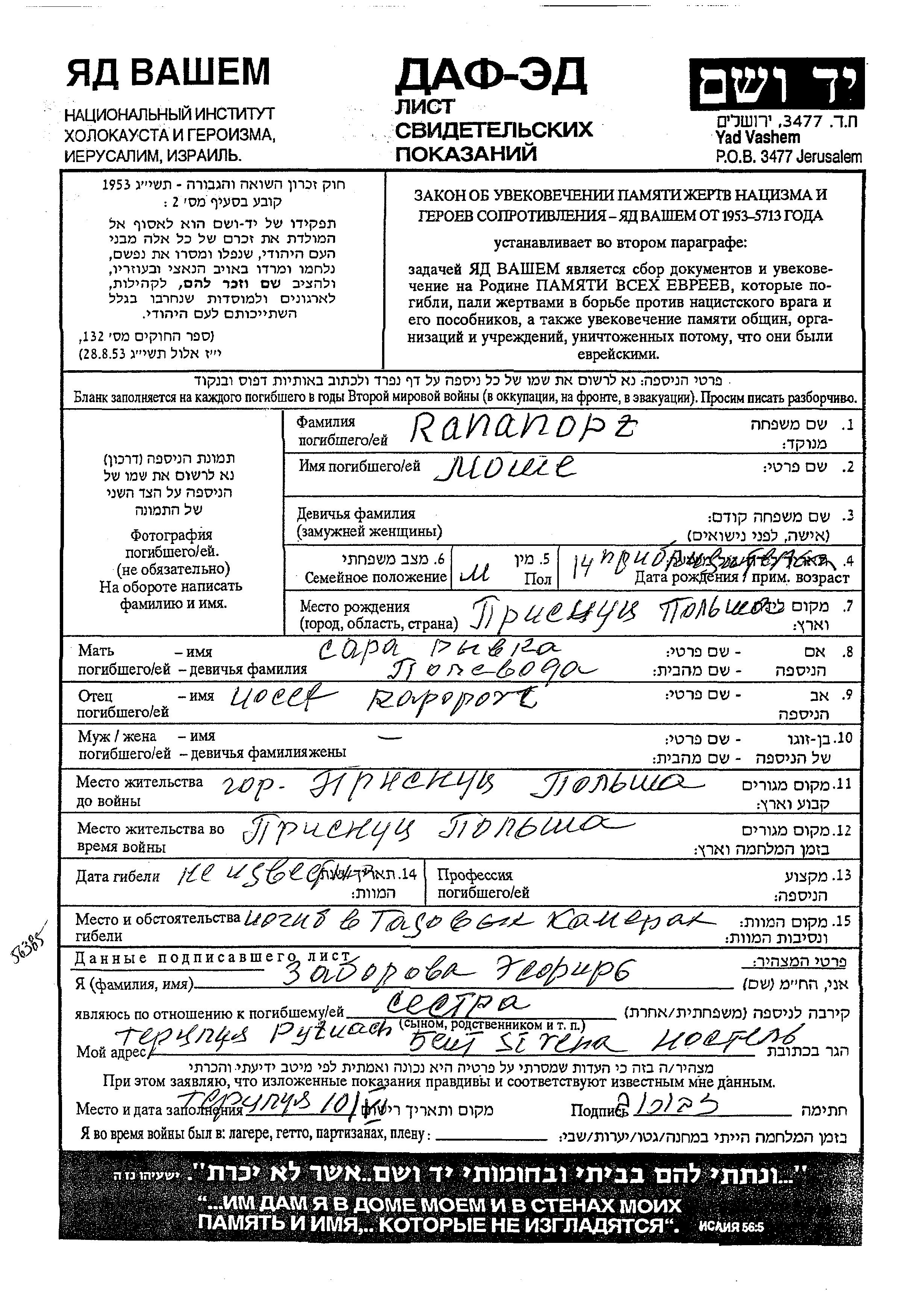 Rapaport Polevoda Moshe Prasznic, Pologne Feuille de témoignage