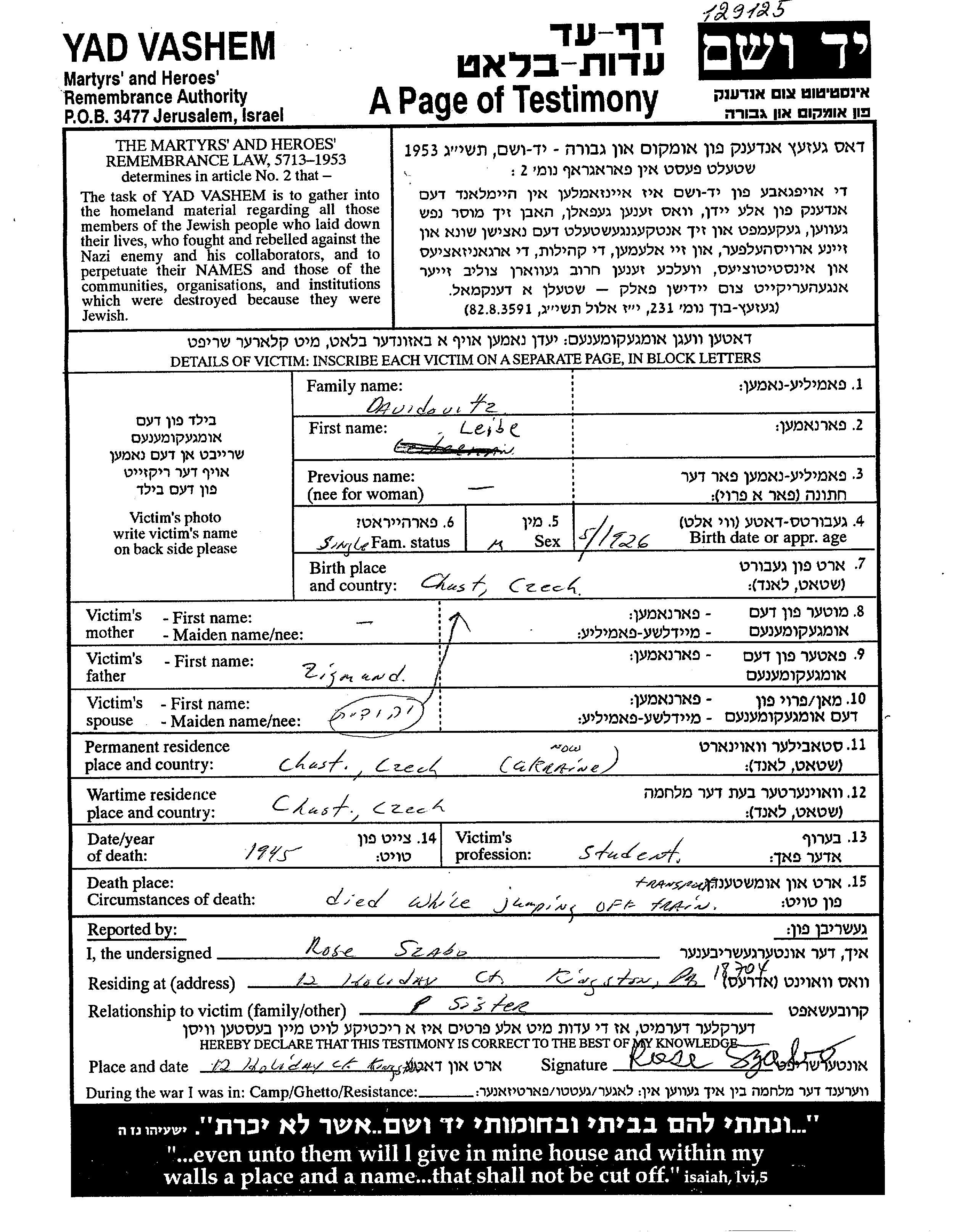 Davidovitz Leibe Leiba 1926 Chust, Tchécoslovaquie Feuille de témoignage