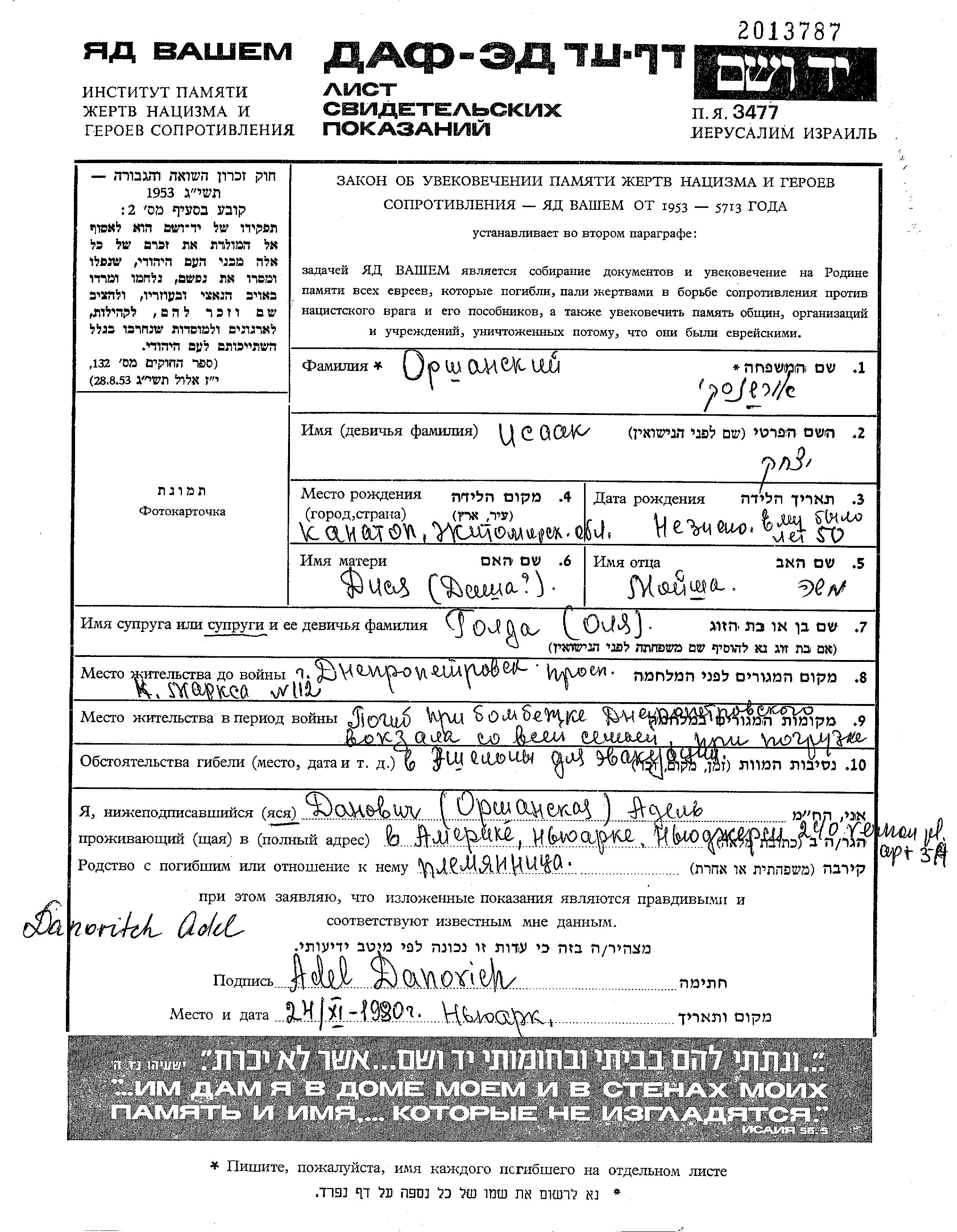 Orshanski Yitzkhak Dnepropetrovsk, Ukraine (URSS) Feuille de témoignage