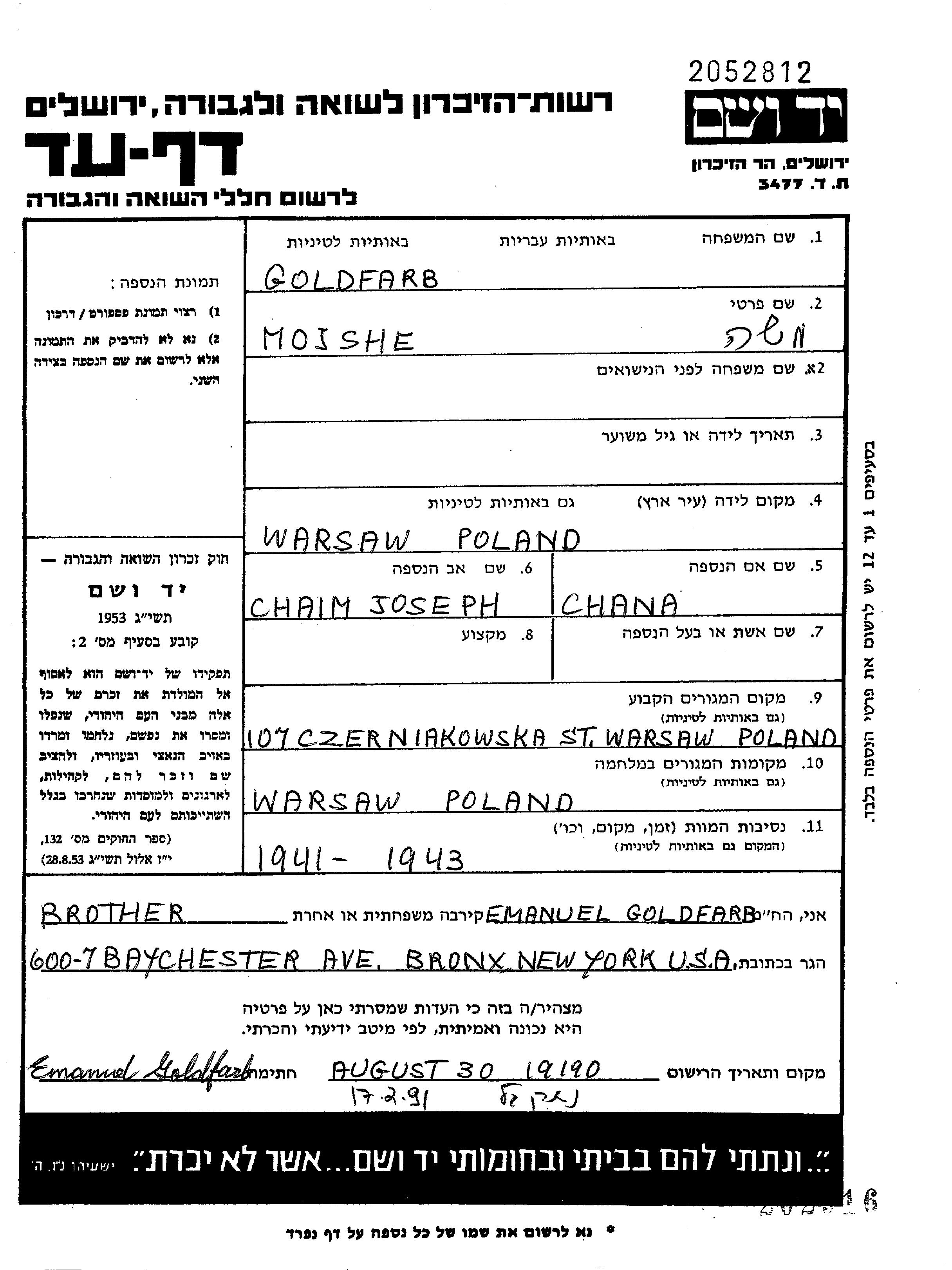 Goldfarb Moshe Warszawa, Pologne Feuille de témoignage