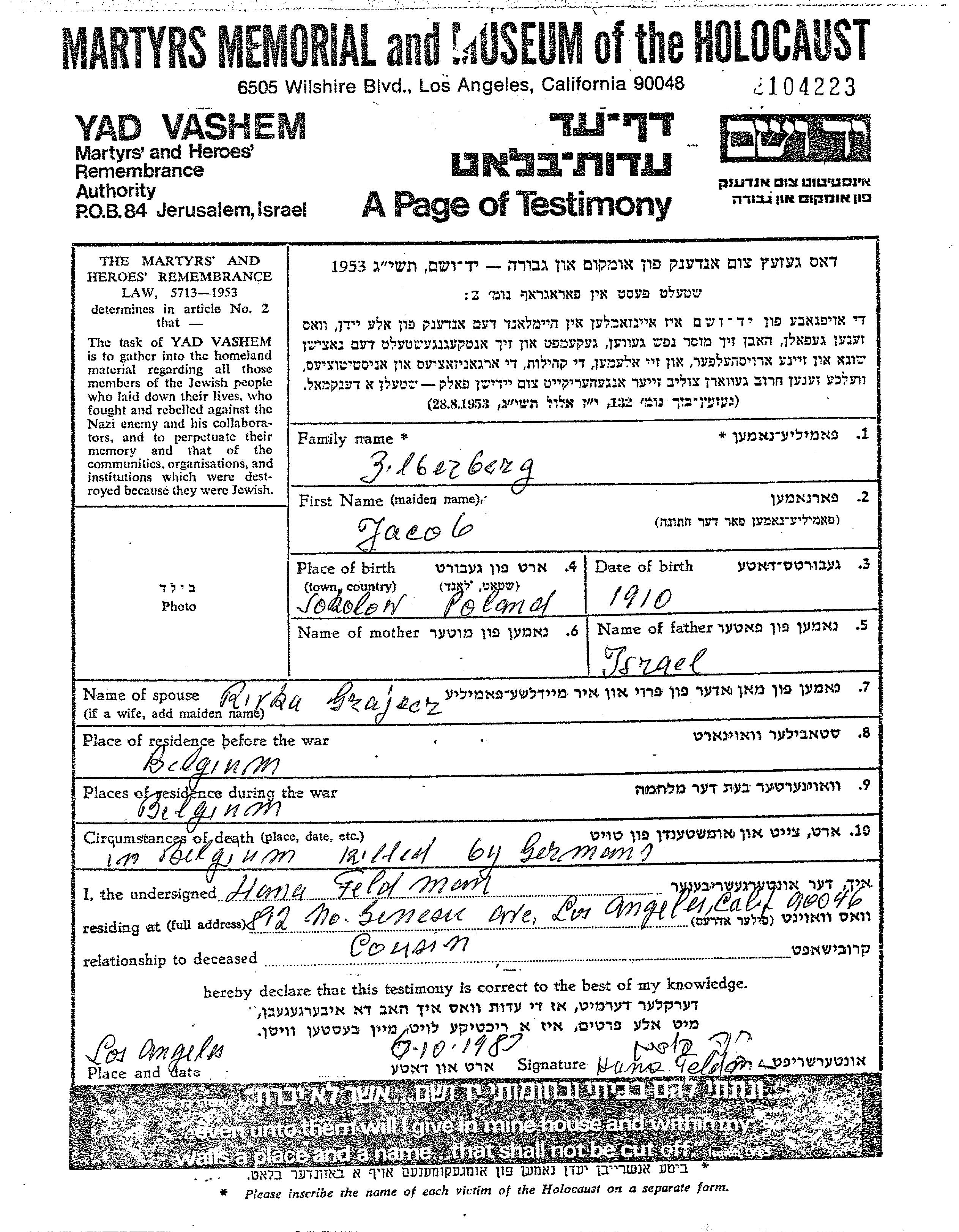 Zylberberg Jankel 1908 endroit inconnu, Feuille de témoignage