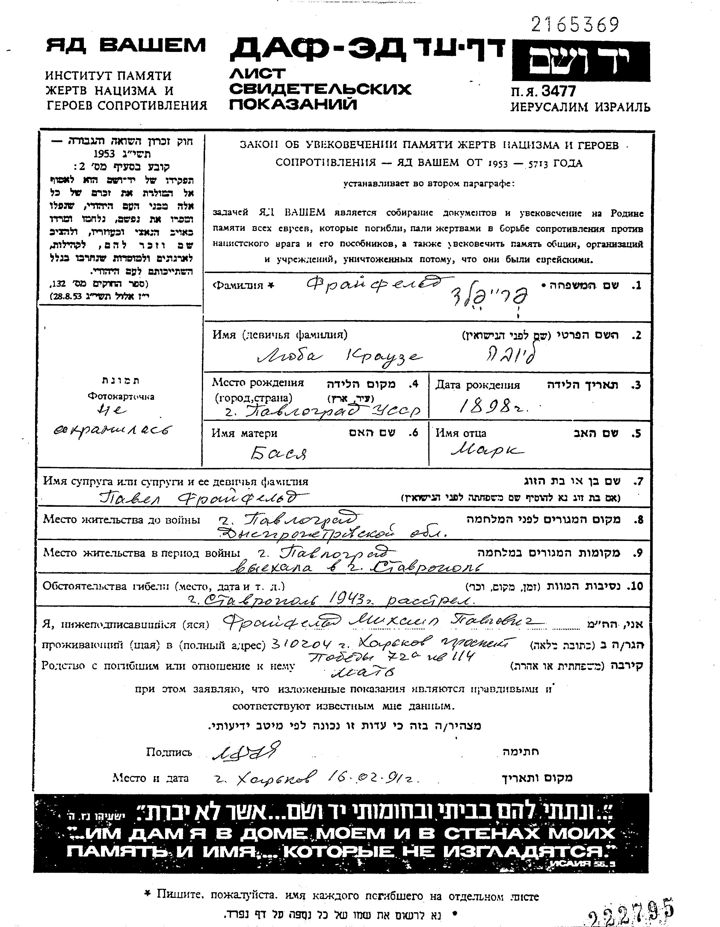 Fraifeld Lyubov 1905 Pavlograd, Ukraine (URSS) Feuille de témoignage