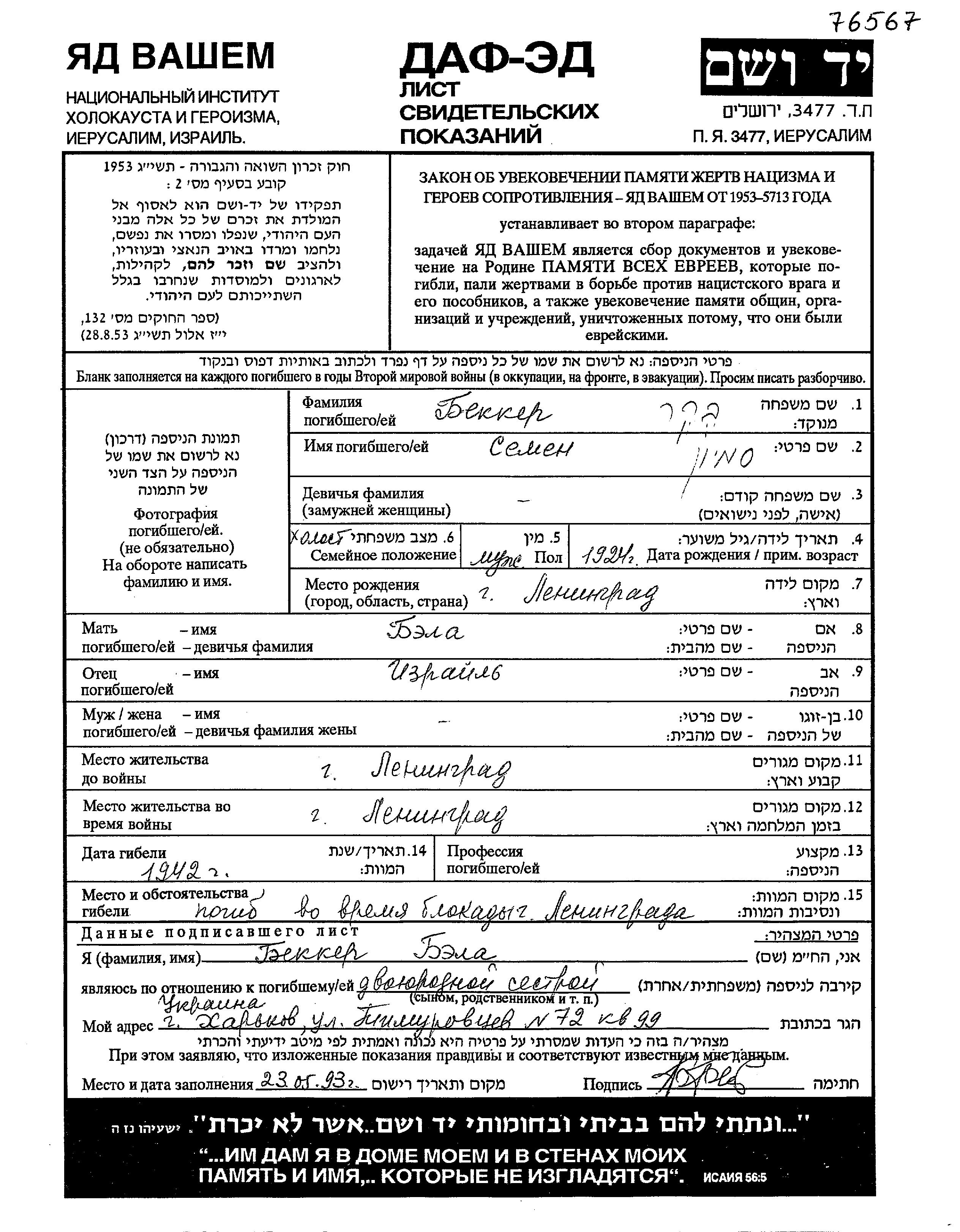 Bekker | Semion | 1927 | Leningrad, Russie (URSS) | Feuille de témoignage |