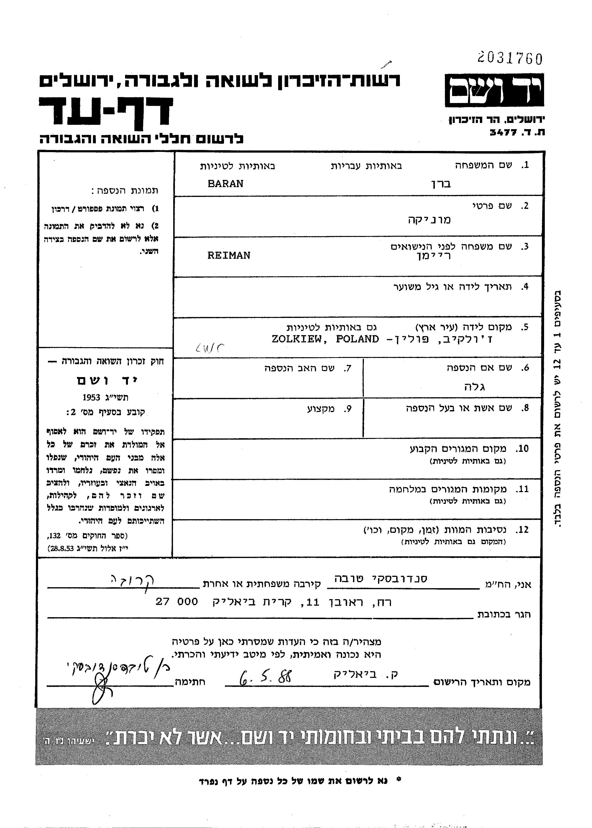 Baran Monika endroit inconnu, Feuille de témoignage