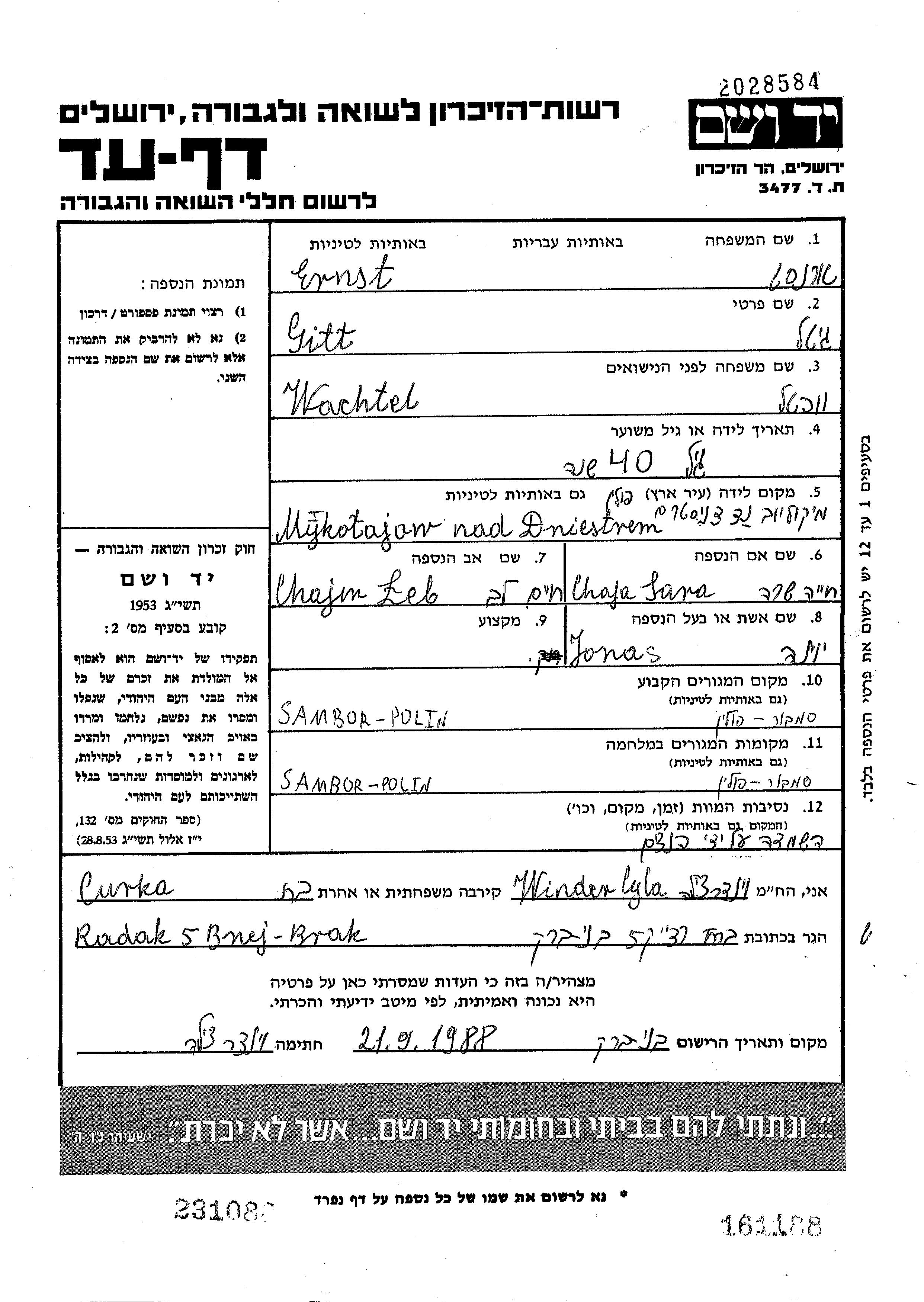 Ernst Gitl Sambor, Pologne Feuille de témoignage
