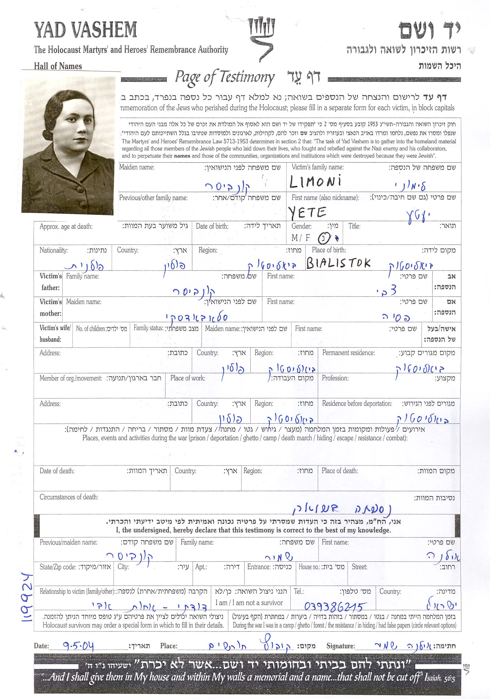 Konwiser Limoni Jeta 1907 Bialystok, Pologne Feuille de témoignage
