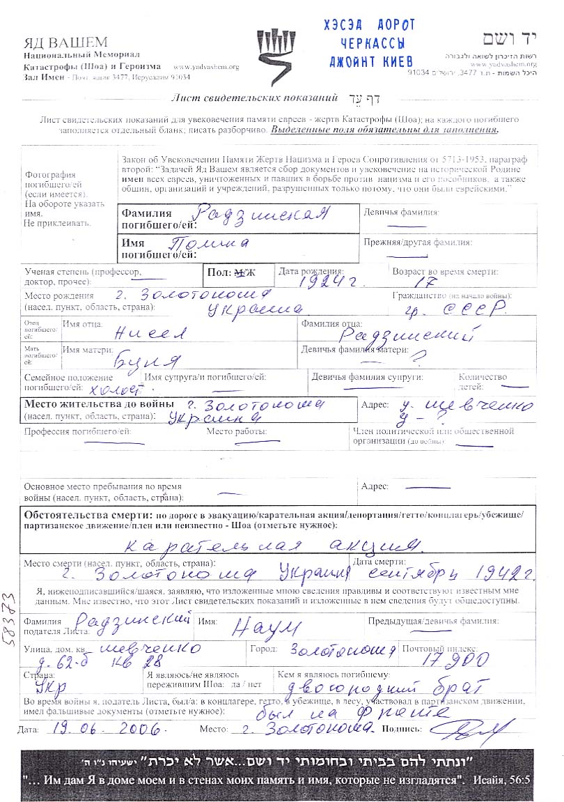 Radzinskaya Polina 1924 Zolotonosha, Ukraine (URSS) Feuille de témoignage
