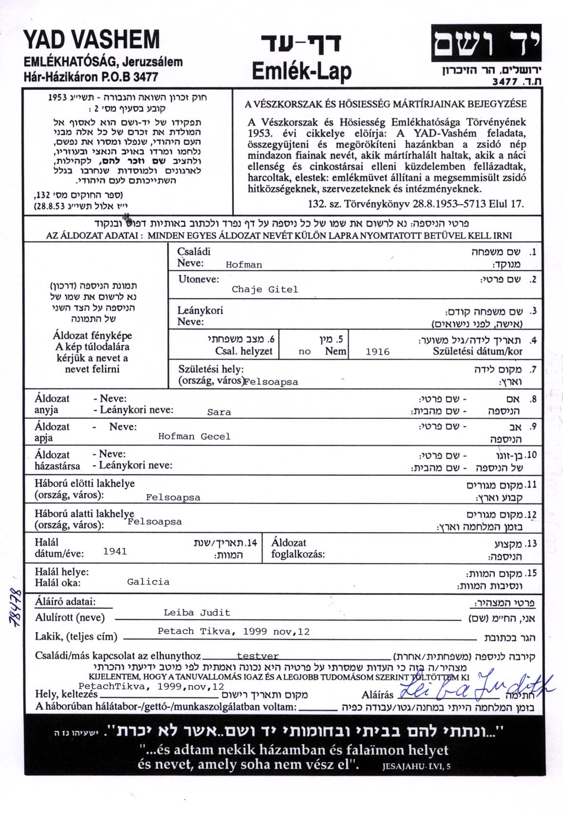 Hofman Chaje Gitel 1916 Felsoapsa, Tchécoslovaquie Feuille de témoignage