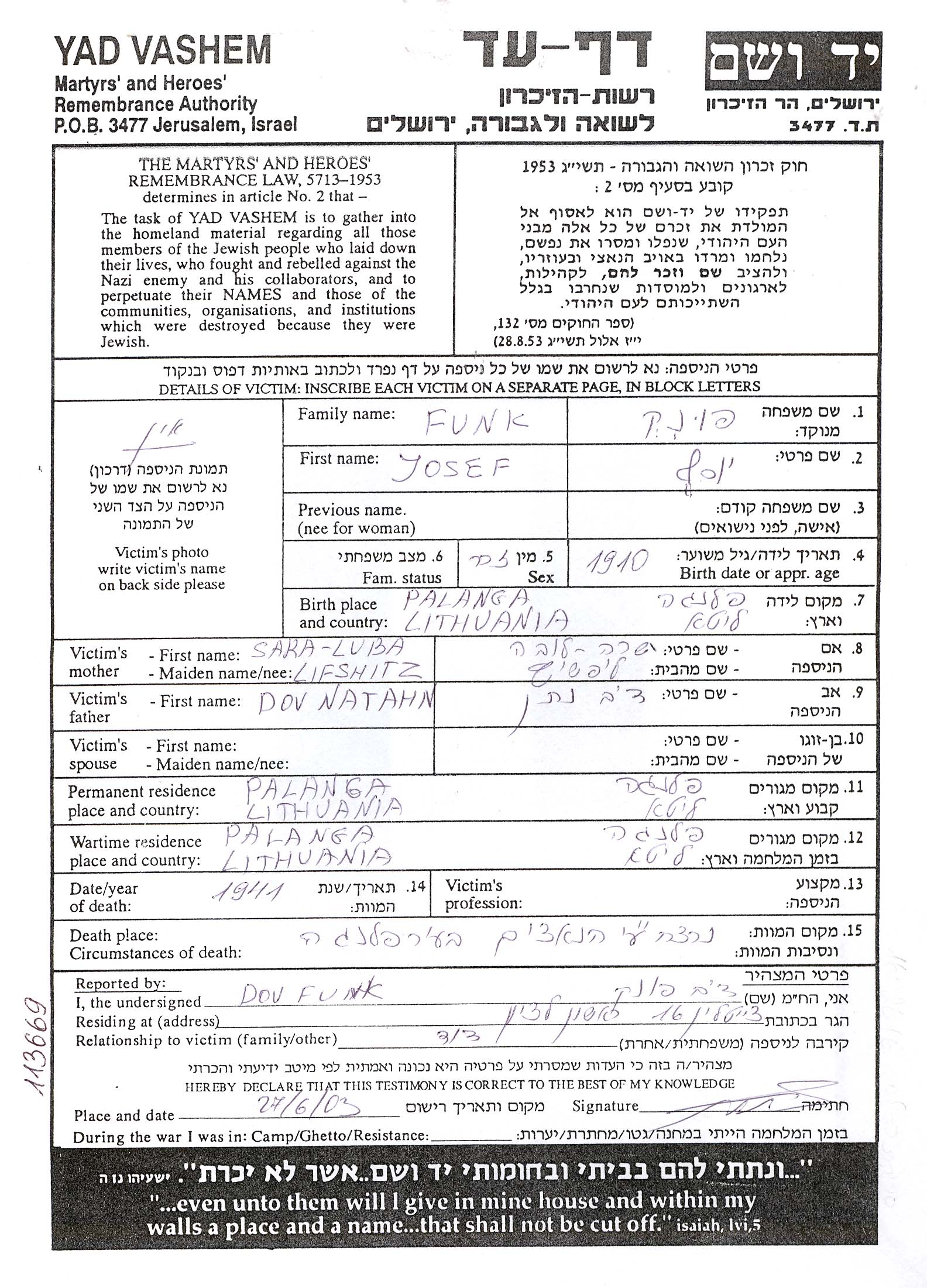 Funk Yosef 1907 Palanga, Lituanie Feuille de témoignage