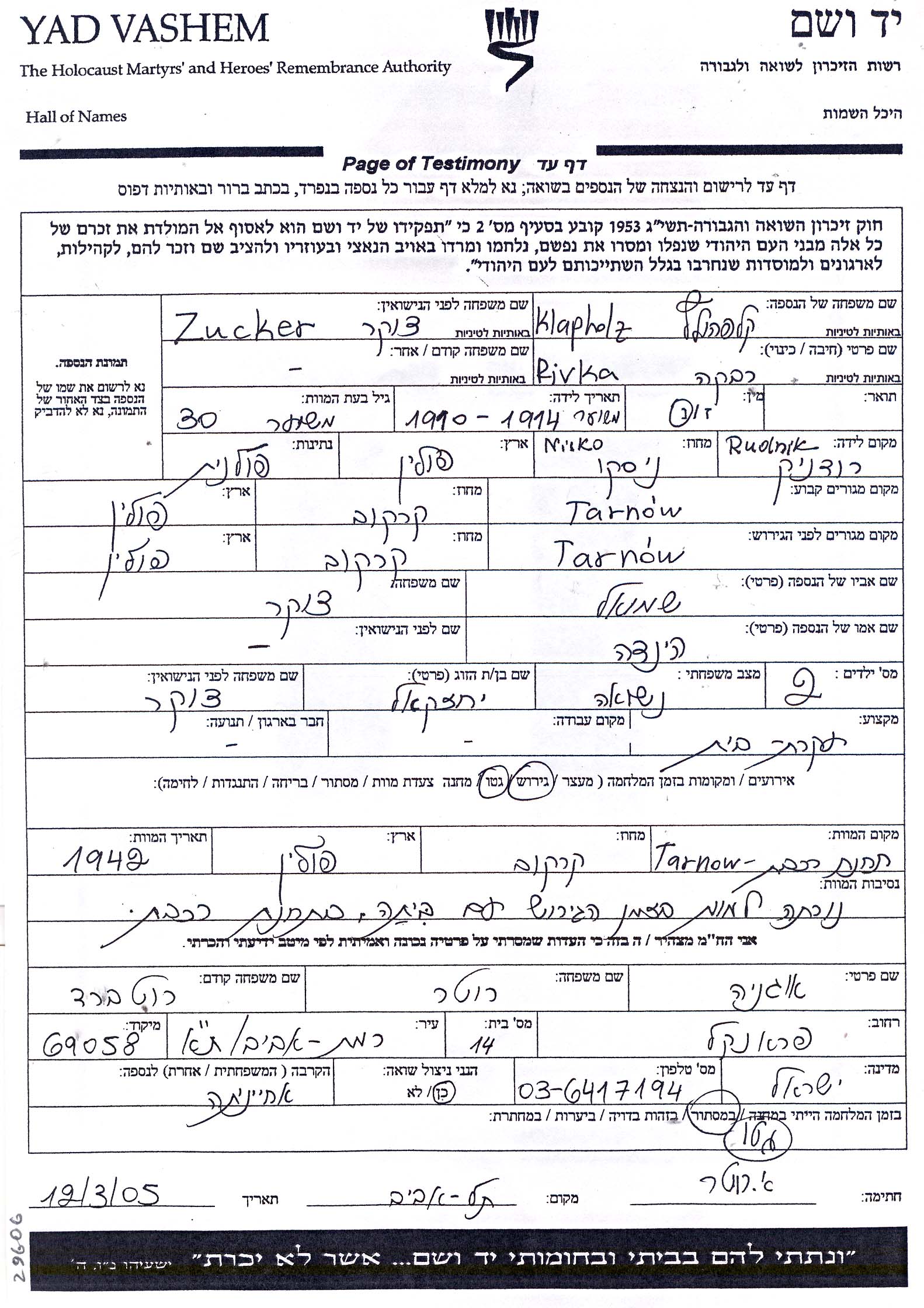 Klapholz | Rivka | 1910 | Tarnow, Pologne | Feuille de témoignage |