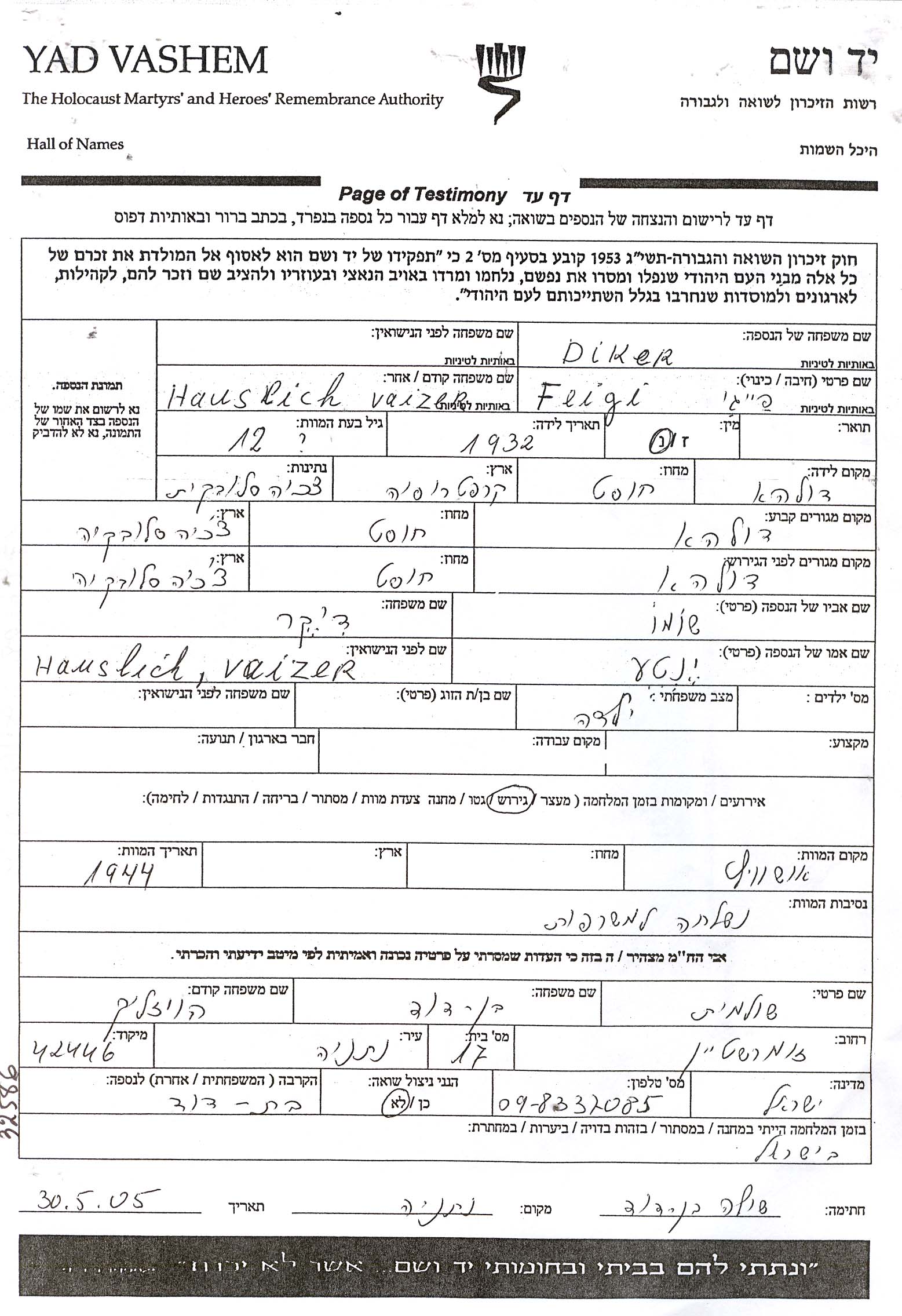 Diker Feigi 1932 Dolha, Tchécoslovaquie Feuille de témoignage