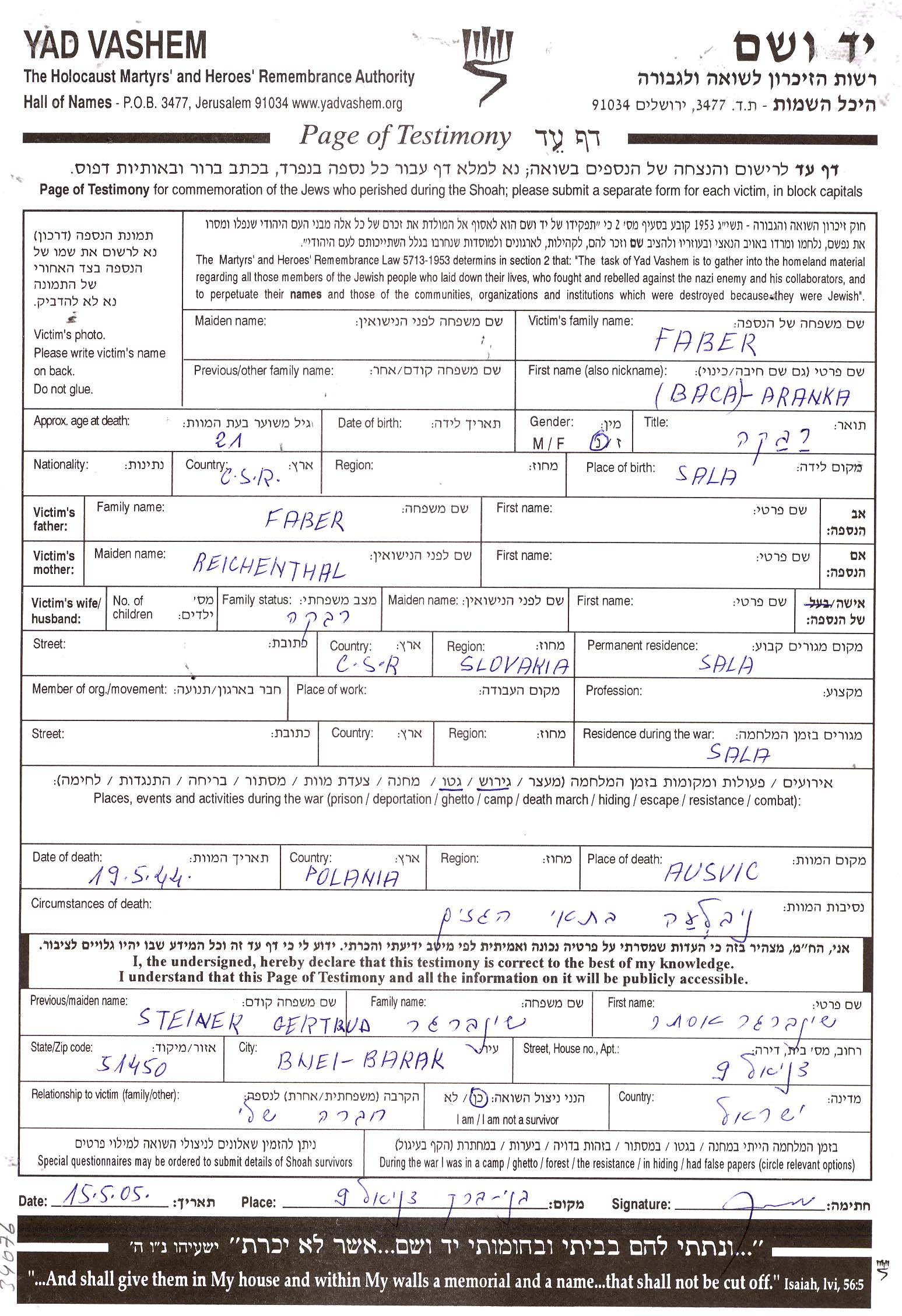 Baka Batia Aranka Faber est née à Sala, Tchécoslovaquie en 1922. Avant la seconde guerre mondiale elle vivait à Sala, Tchécoslovaquie.