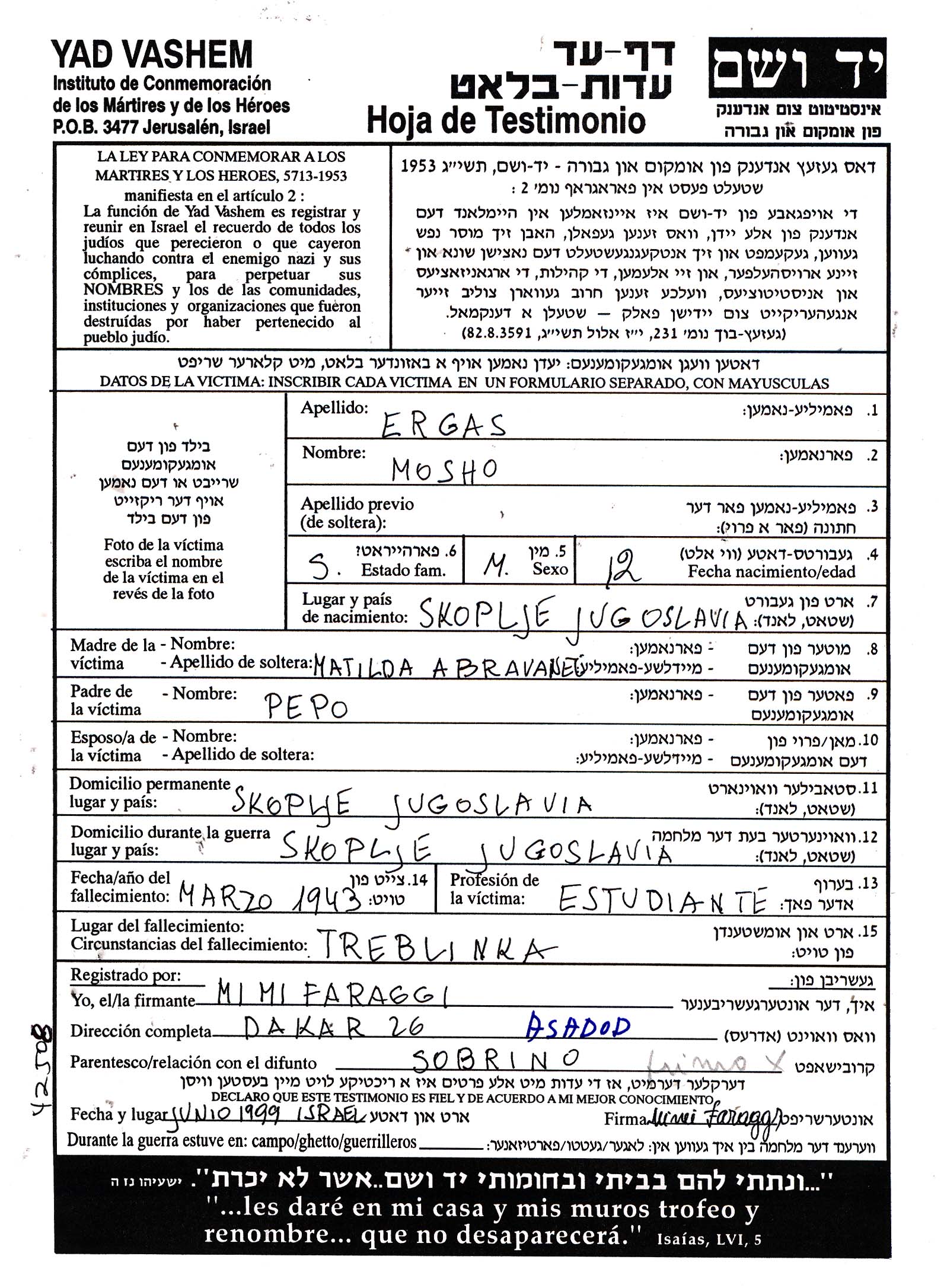 Ergas | Moshe | 1932 | Skopje, Yugoslavie | Feuille de témoignage |