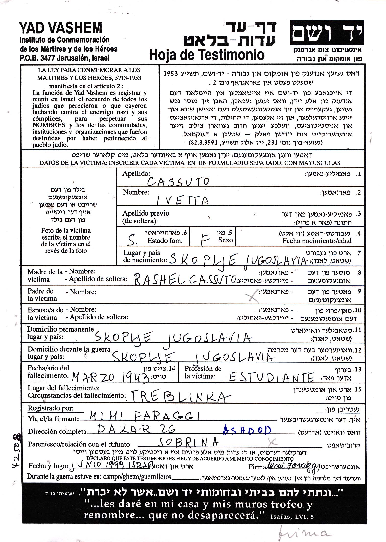 Kasuto | Iveta | 1933 | Skopje, Yugoslavie | Feuille de témoignage |
