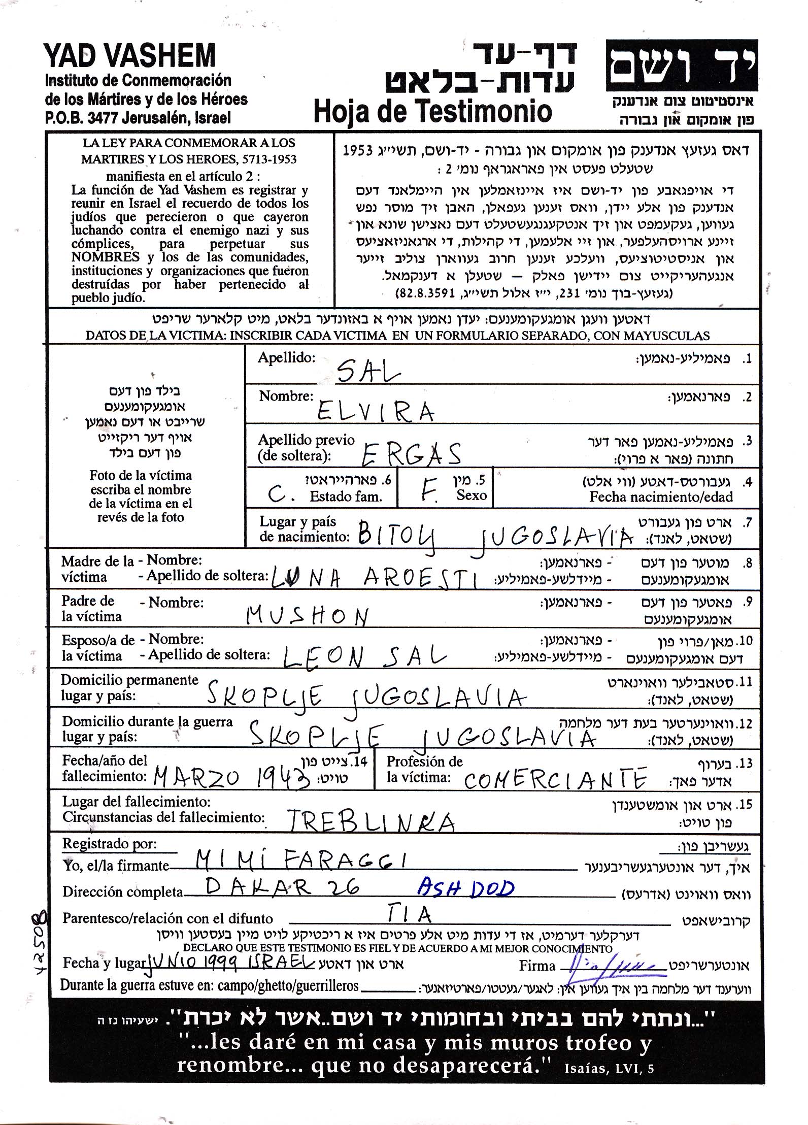 Sal Sel | Elvira | 1905 | Skopje, Yugoslavie | Feuille de témoignage |