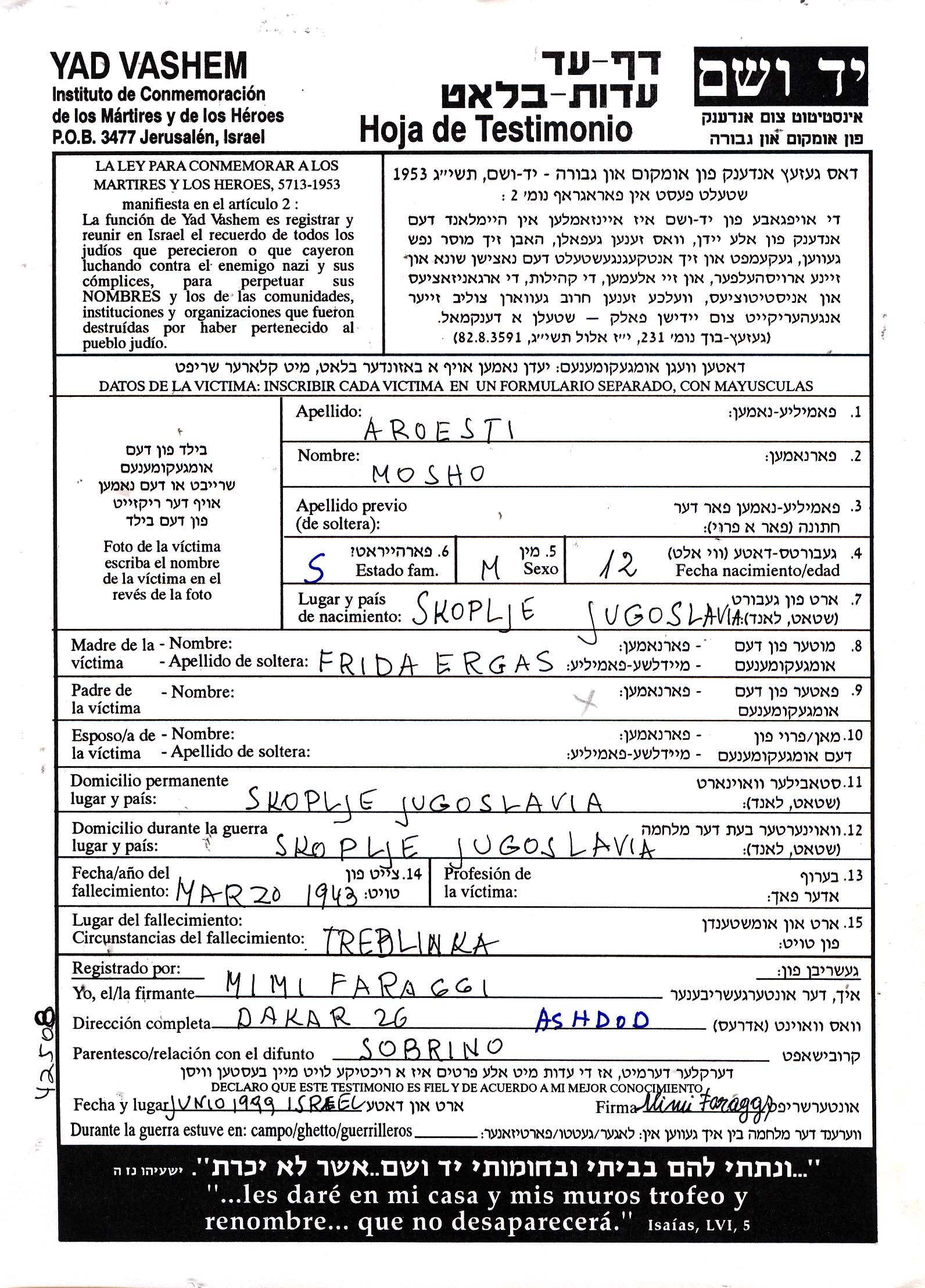 Aroesti Moshe 1930 Skopje, Yugoslavie Feuille de témoignage