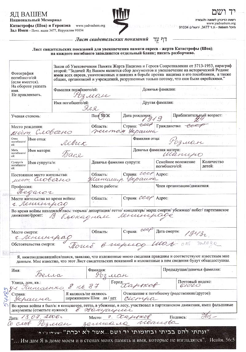 Rozman | Ele Ela | 1921 | Vyborg, Finlande | Feuille de témoignage |