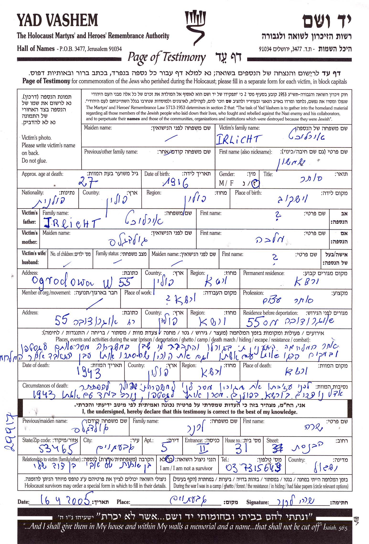 Irlicht | Shimshon | 1916 | Warszawa, Pologne | Feuille de témoignage |
