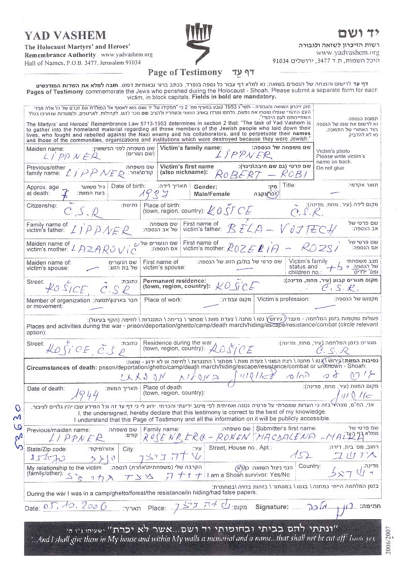Lippner Robert 1937 Kosice, Tchécoslovaquie Feuille de témoignage
