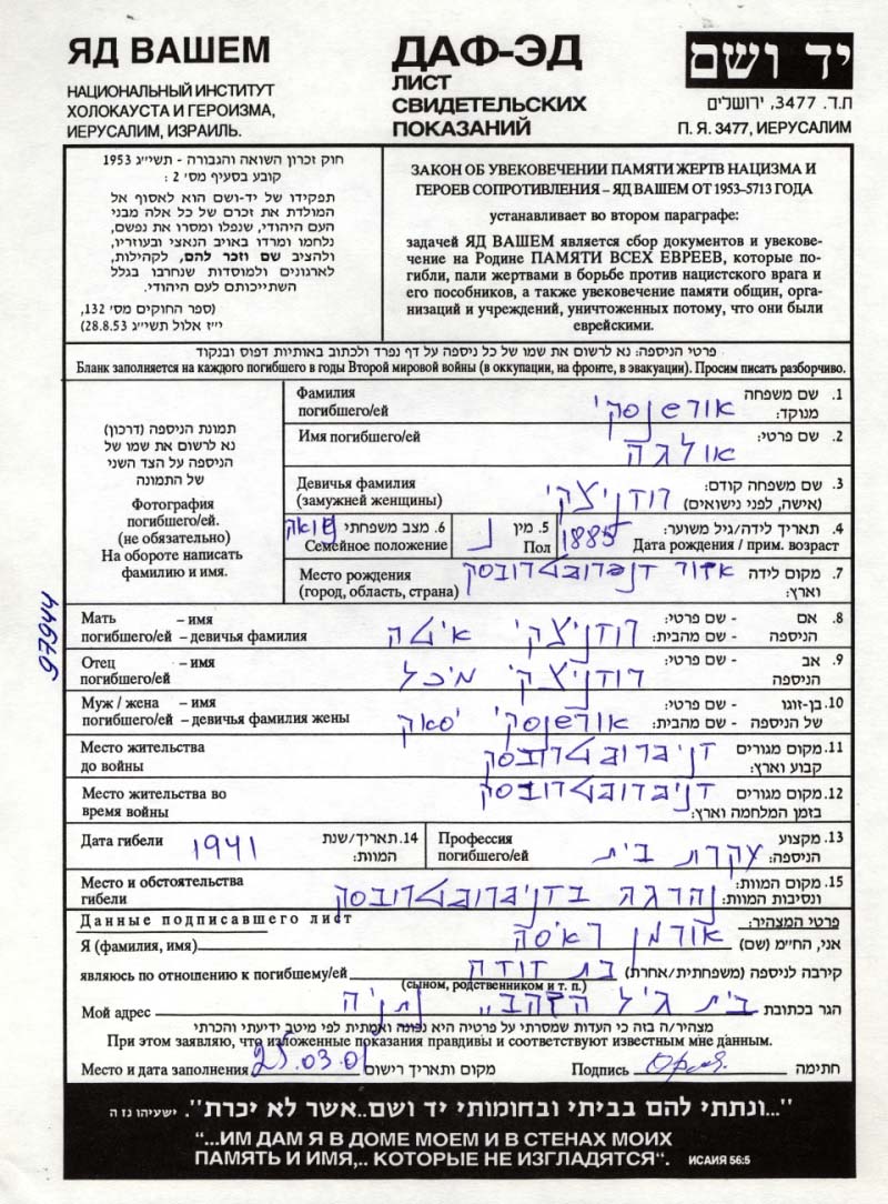 Orshanski Golda Olga Dnepropetrovsk, Ukraine (URSS) Feuille de témoignage