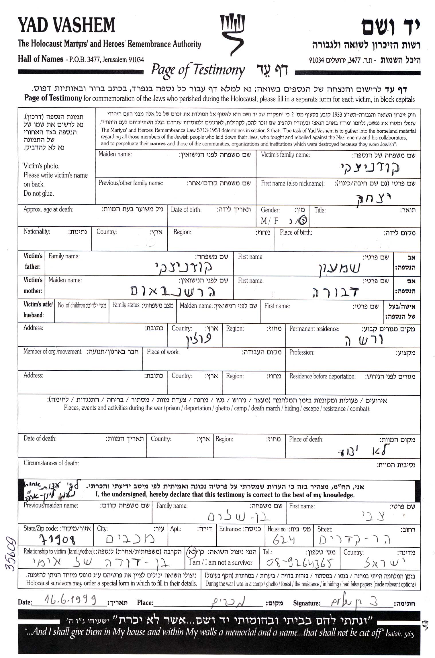 Kuznitzki | Yitzkhak | Warszawa, Pologne | Feuille de témoignage | |