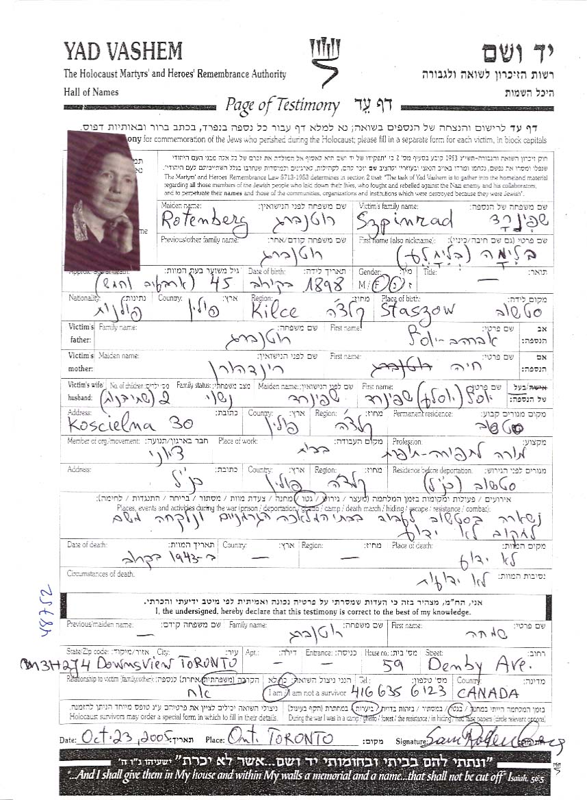 Bluma Szpinrad née Rotenberg est née à Staszow, Pologne. Elle était Couturière. Avant la seconde guerre mondiale elle vivait à Staszow, Pologne.