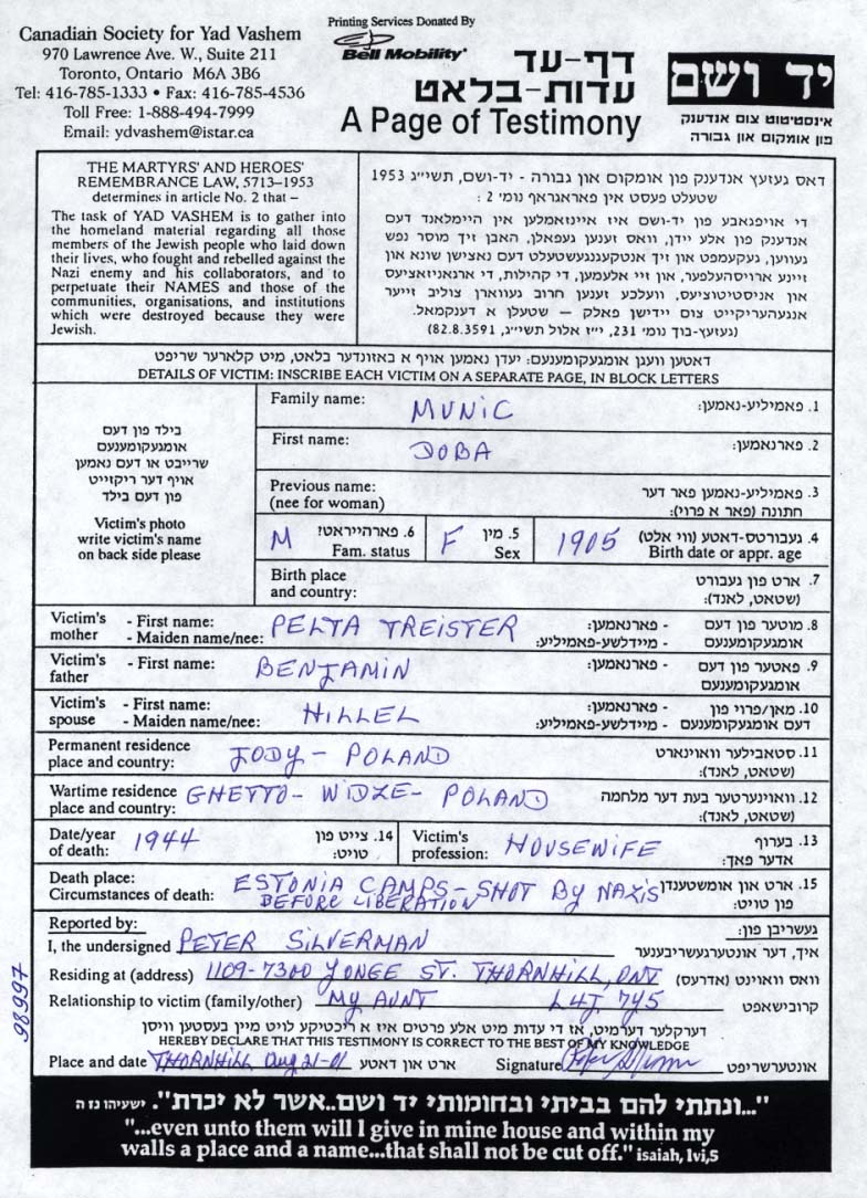 Doba Munic née Silberman est née à Jody, Pologne en 1905. Elle était Femme au foyer. Avant la seconde guerre mondiale elle vivait à Jody, Pologne.