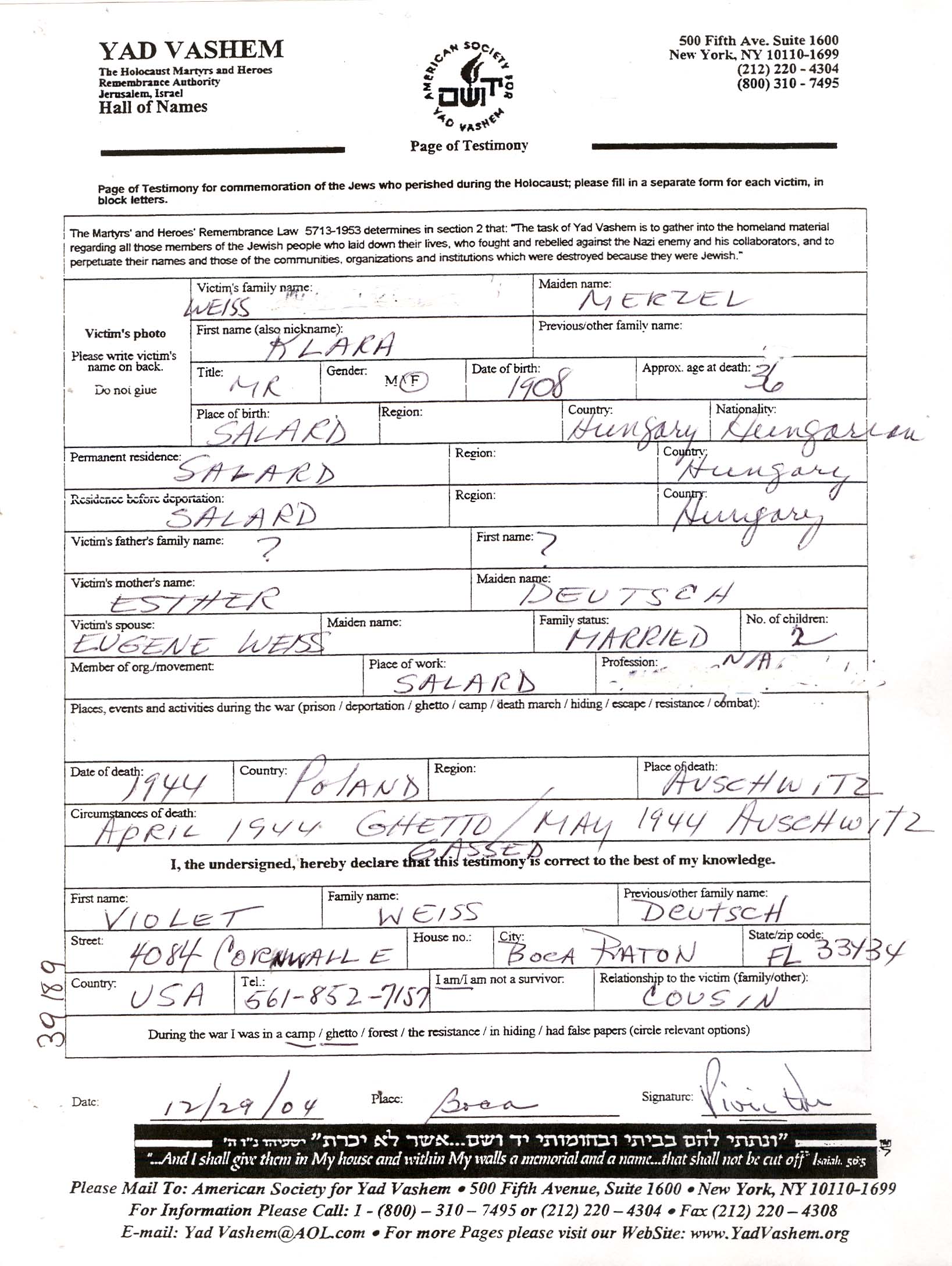 Weisz Klara 1908 Szalard, Roumanie Feuille de témoignage
