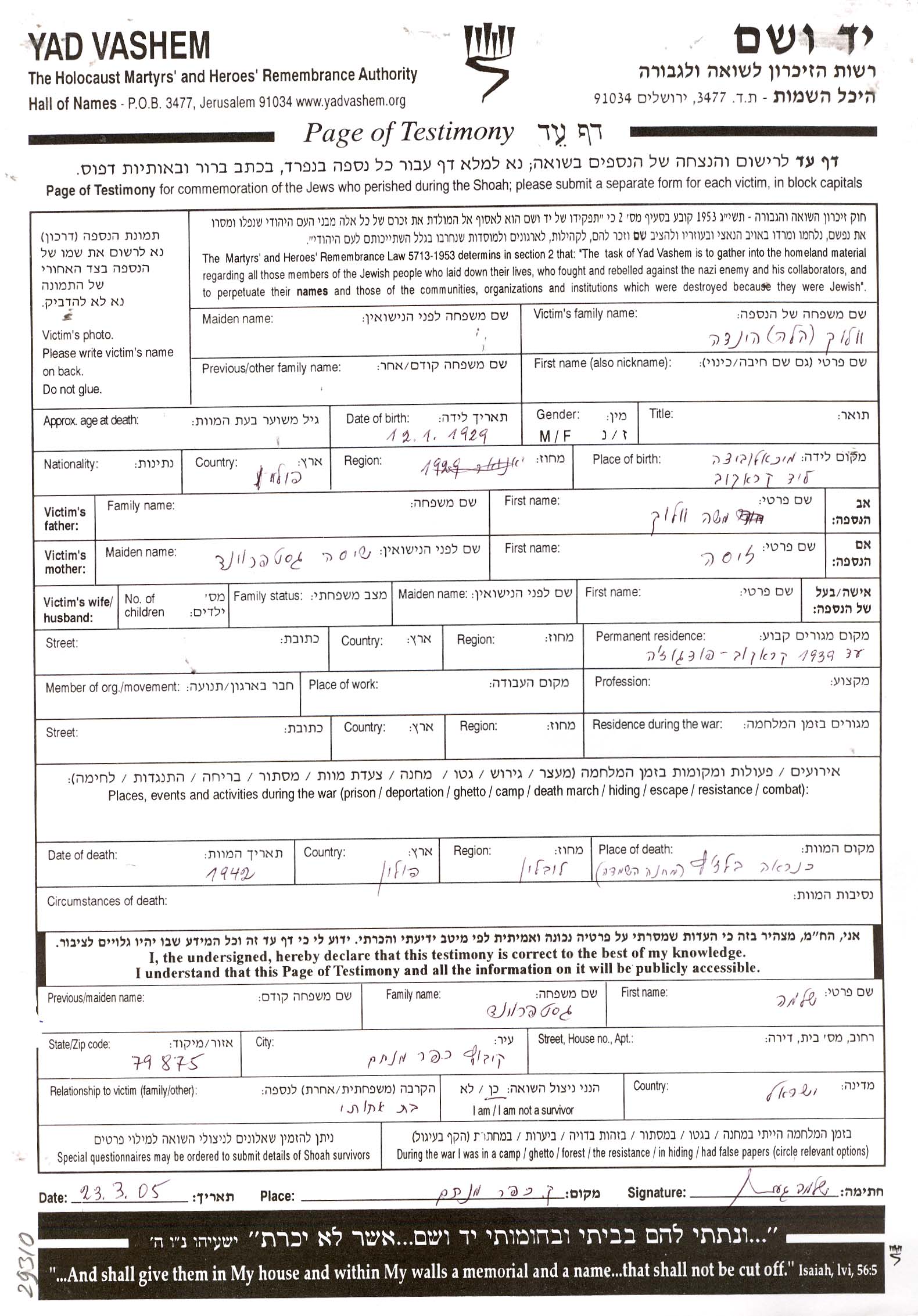 Yad Vashem - Pages of Testimony Names Memorial Collection