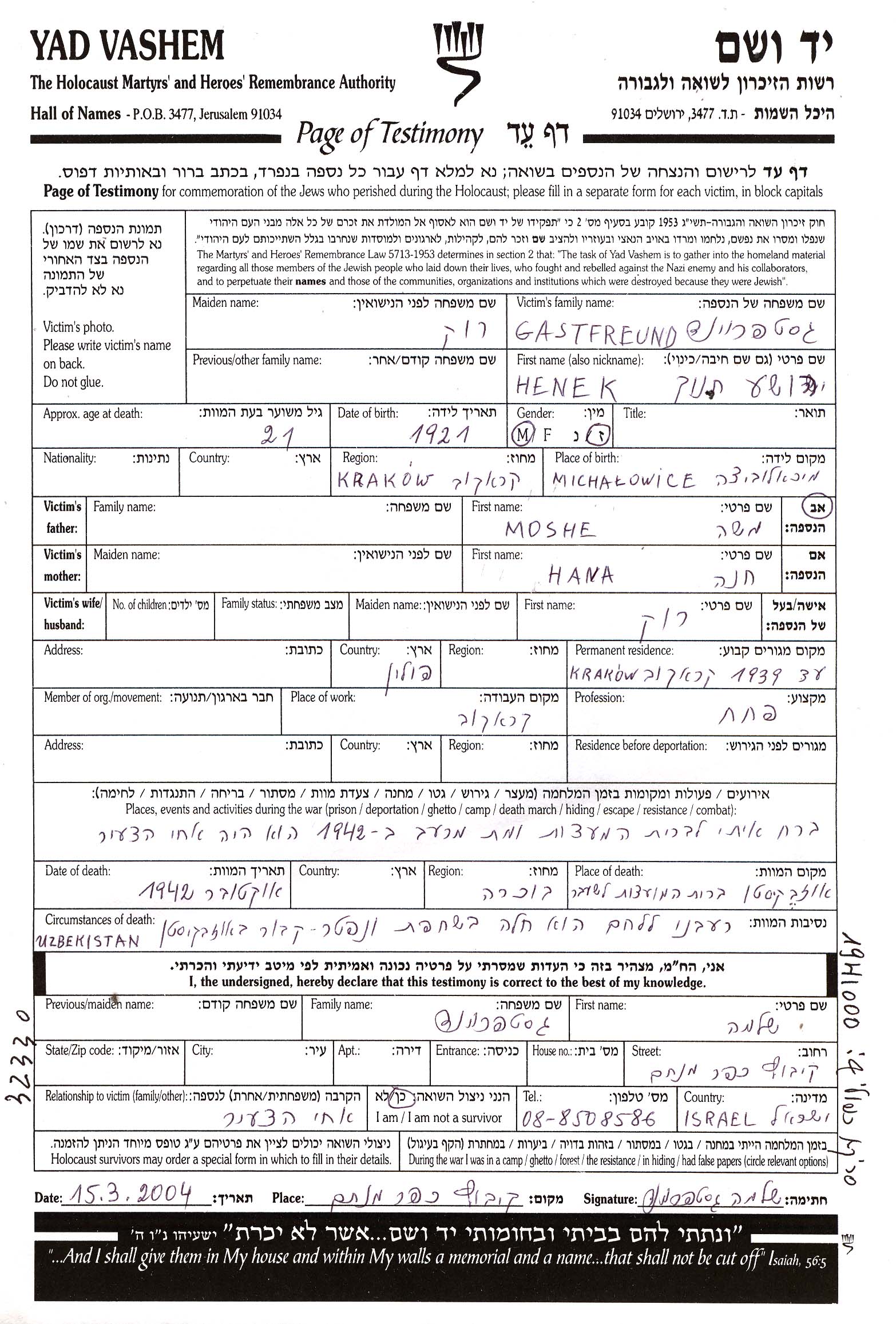 Gastfreund Henek Yehoshua Khanokh 1921 Krakow, Pologne Feuille de témoignage