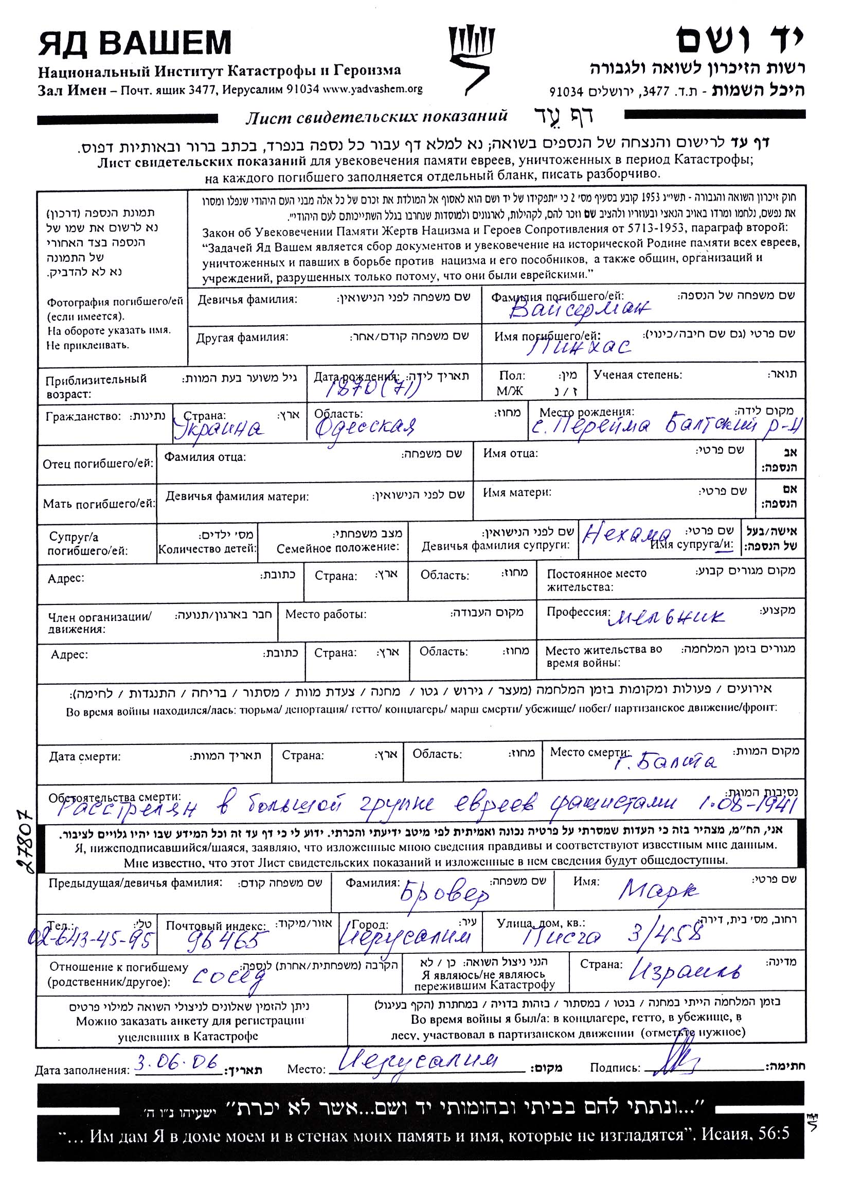 Vaiserman Pinkhus 1866 Balta, Ukraine (URSS) Feuille de témoignage