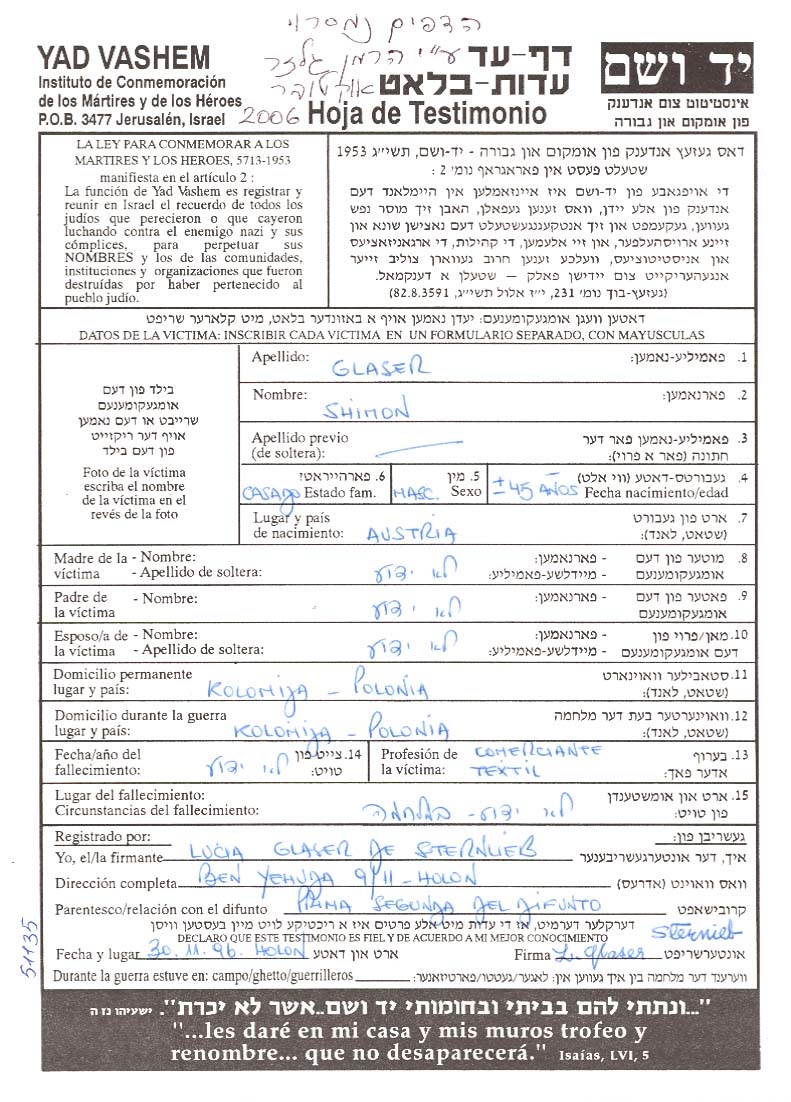 Glaser Simon Kolomyja, Pologne Feuille de témoignage