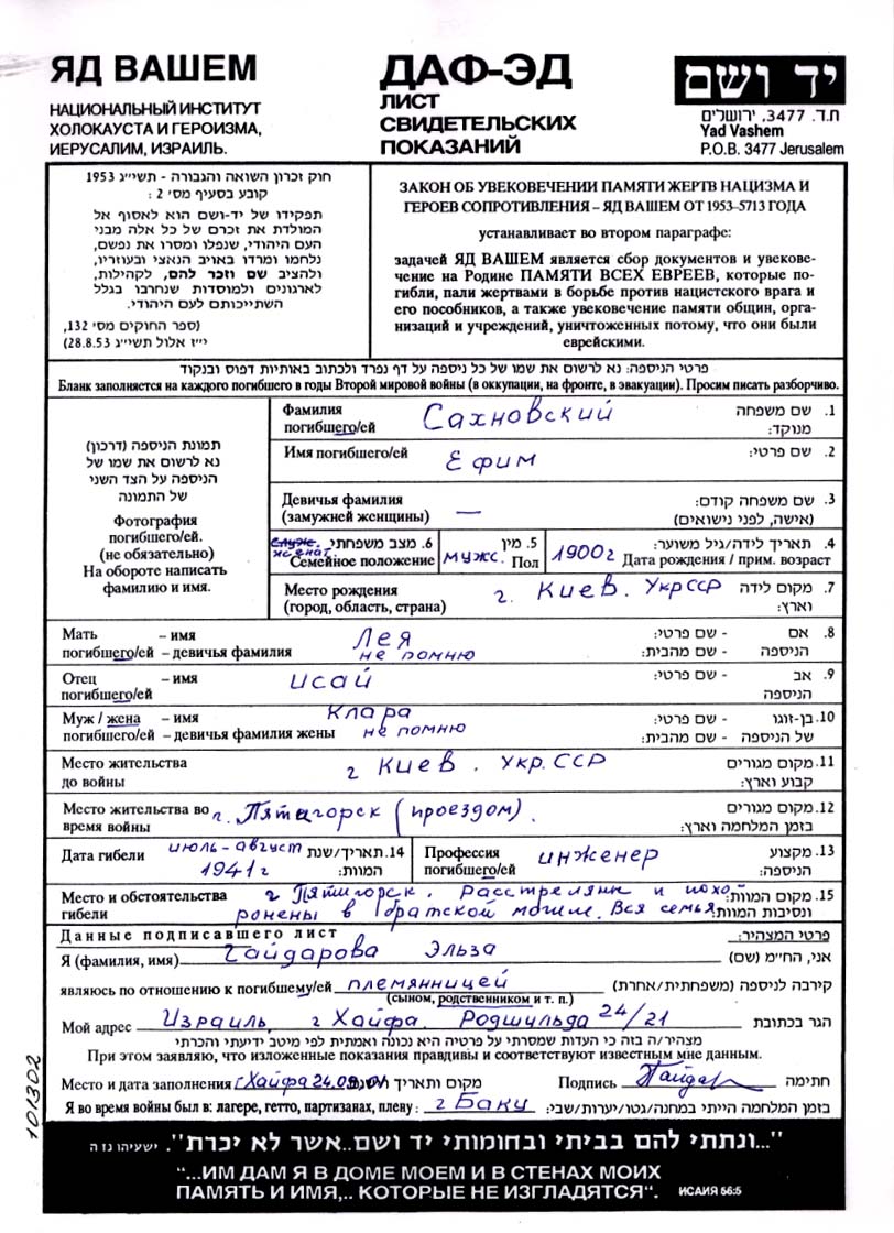 Sakhnovski | Khaim | 1889 | Kiev, Ukraine (URSS) | Feuille de témoignage |
