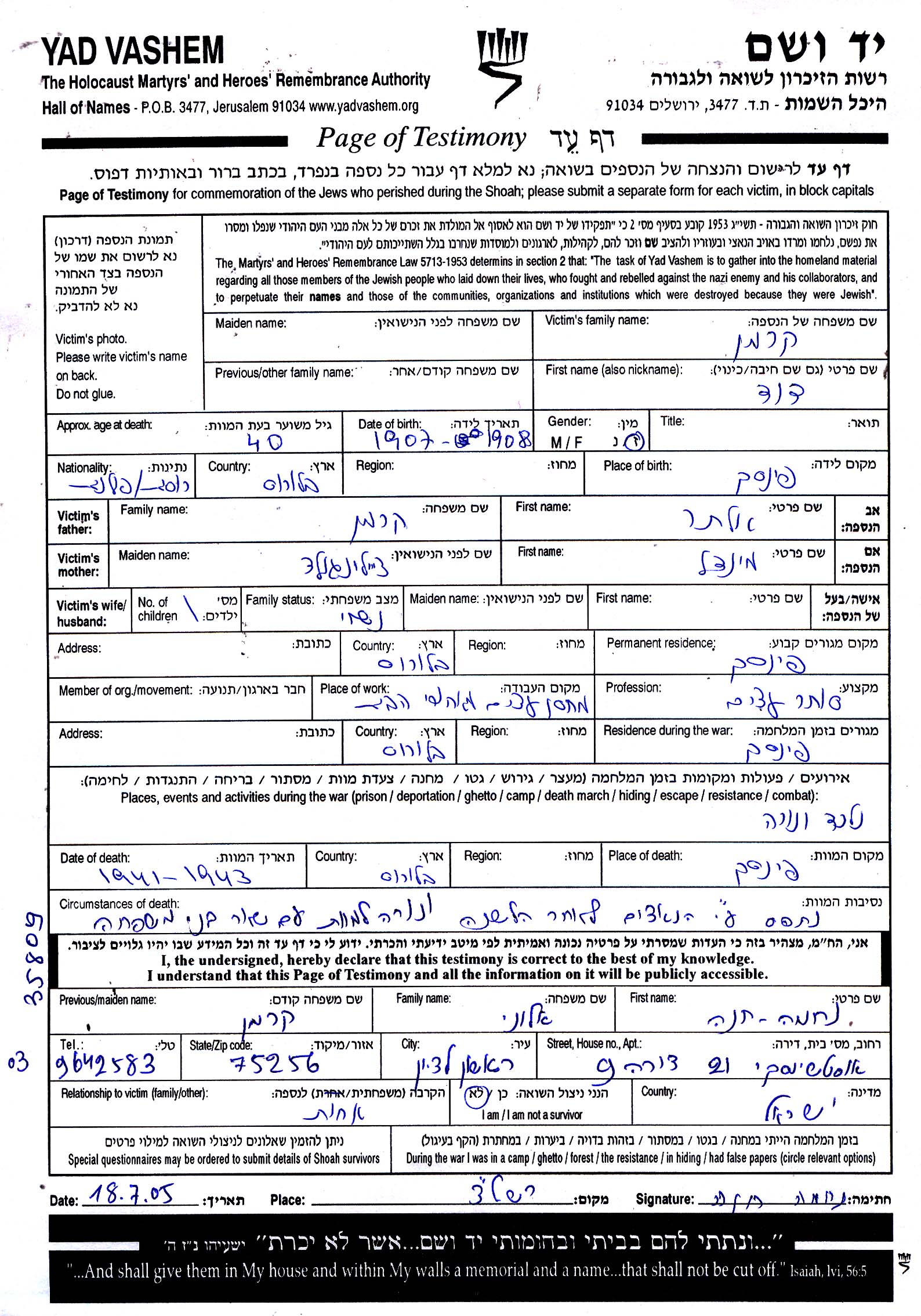 Yad Vashem - Pages of Testimony Names Memorial Collection