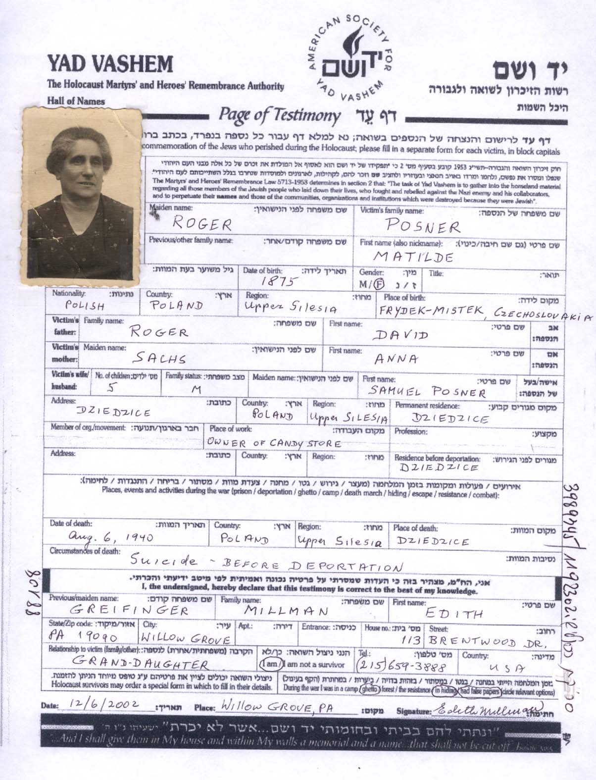 Mathilde Posner née Roger est née à Frydek, Tchécoslovaquie en 1874. Elle était Femme au foyer. Avant la seconde guerre mondiale elle vivait à Dziedzice, Pologne.