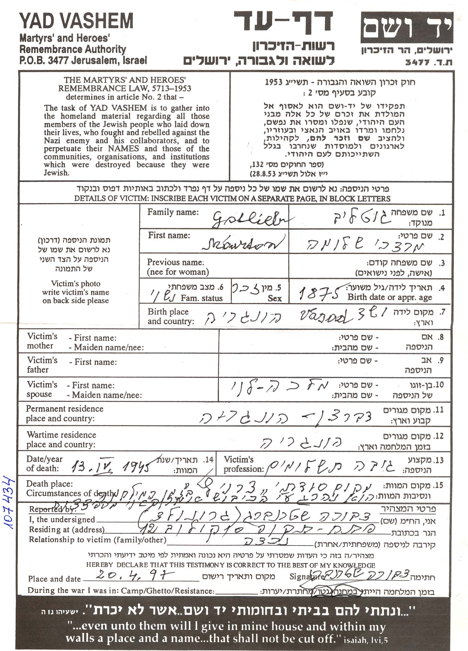 Gotlib | Mordechaj Slomo | 1875 | Debrecen, Hongrie | Feuille de témoignage |