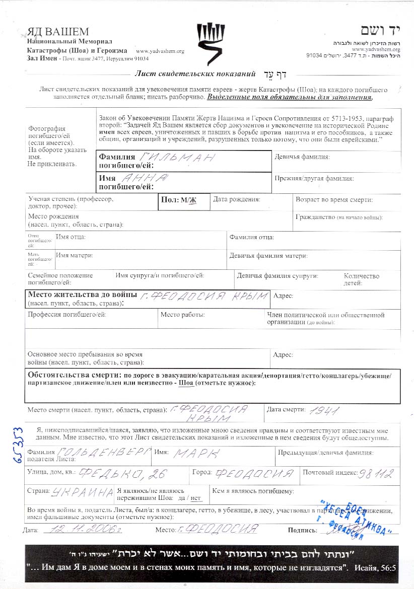 Yad Vashem - Pages of Testimony Names Memorial Collection