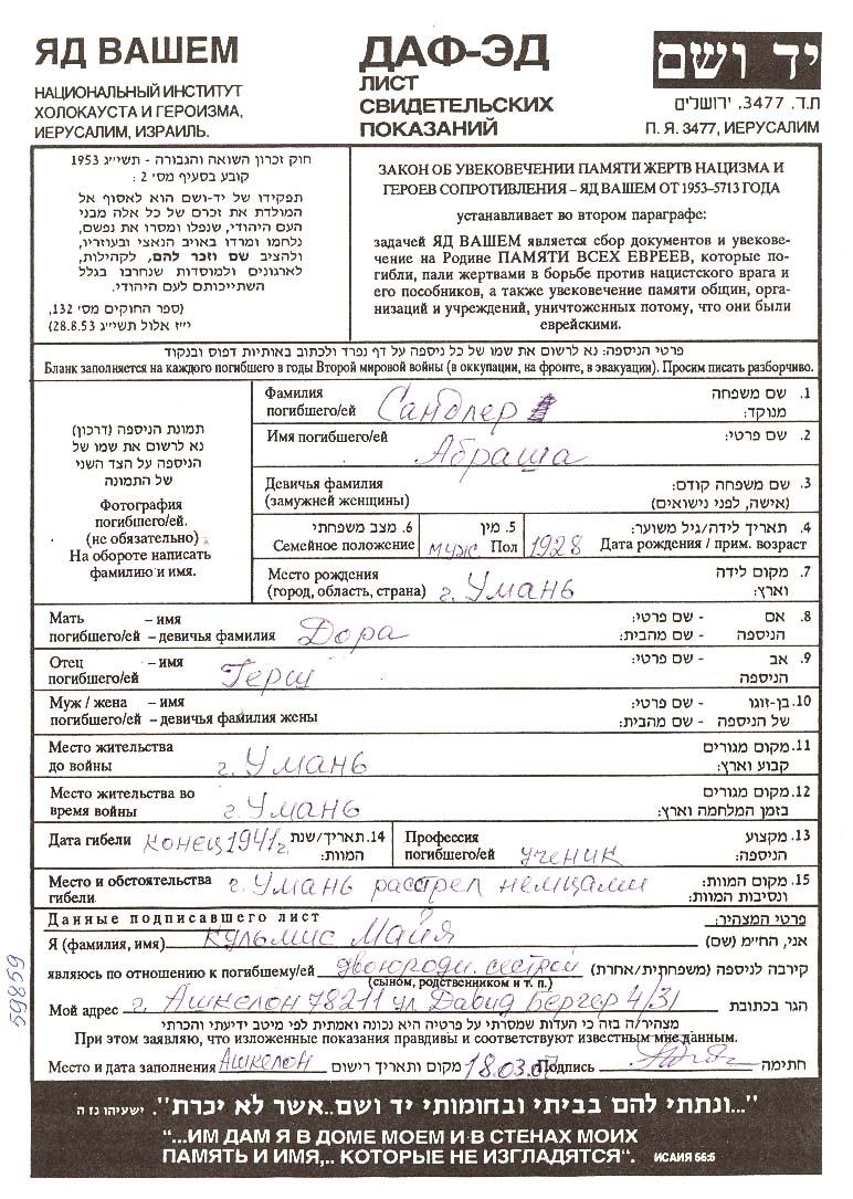 Sandler Abrasha Uman, Ukraine (URSS) Feuille de témoignage