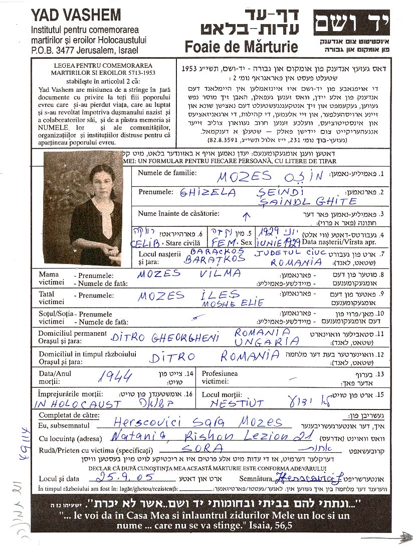 Mozes Gizela Sheina 1929 Ditro, Roumanie Feuille de témoignage