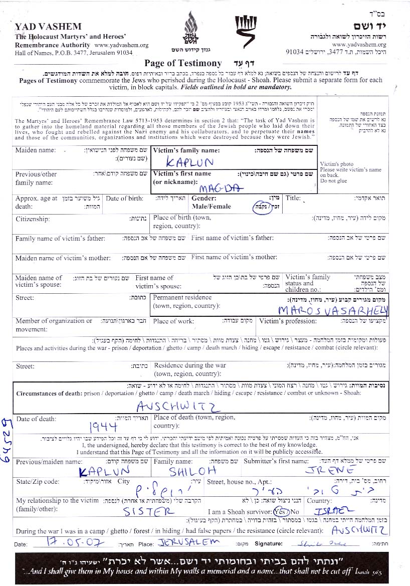 Kaplun | Malka Magda | 1929 | Marosvasarhej, Roumanie | Feuille de témoignage |