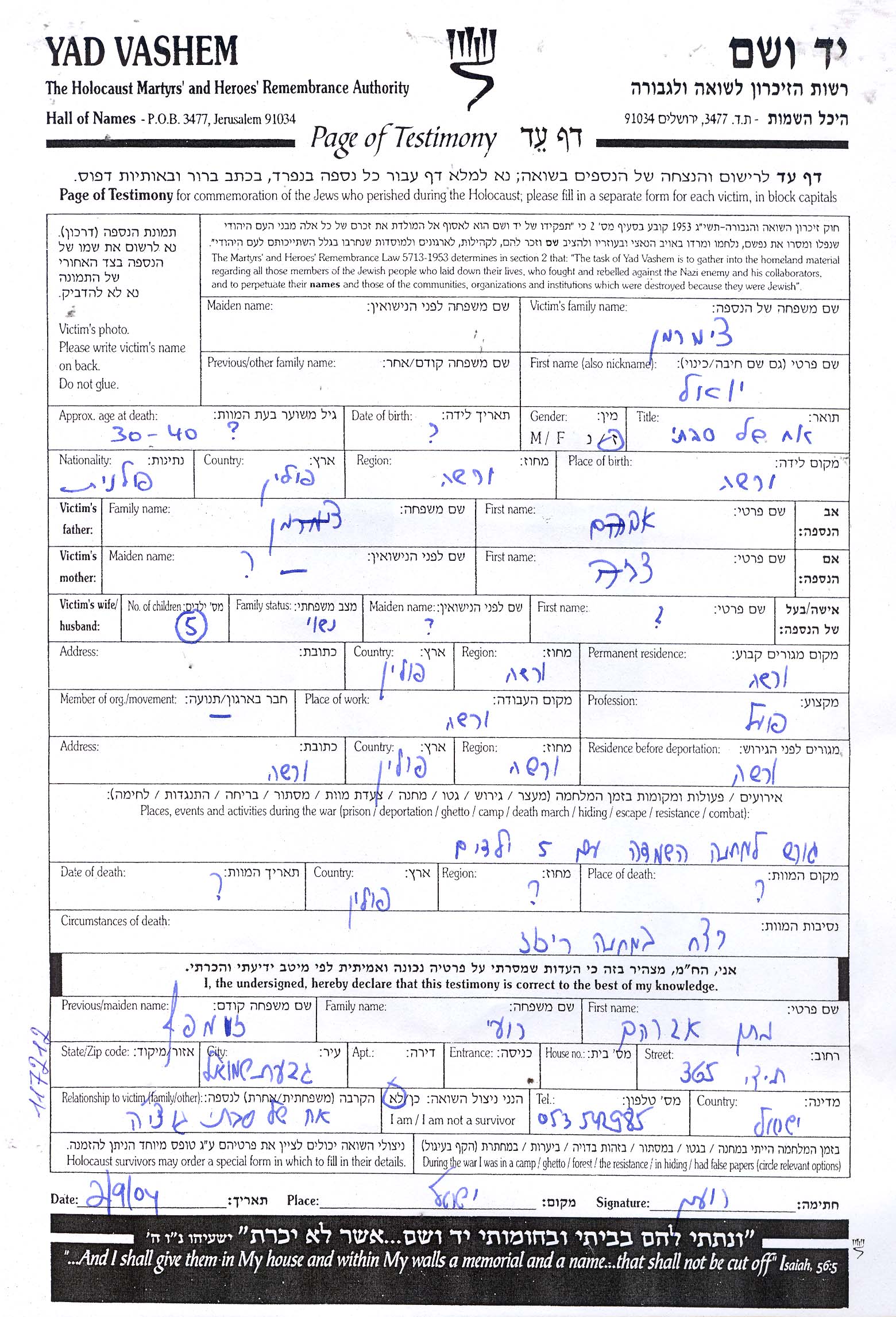Tzimerman | Yoel | Warsaw, Pologne | Feuille de témoignage | |