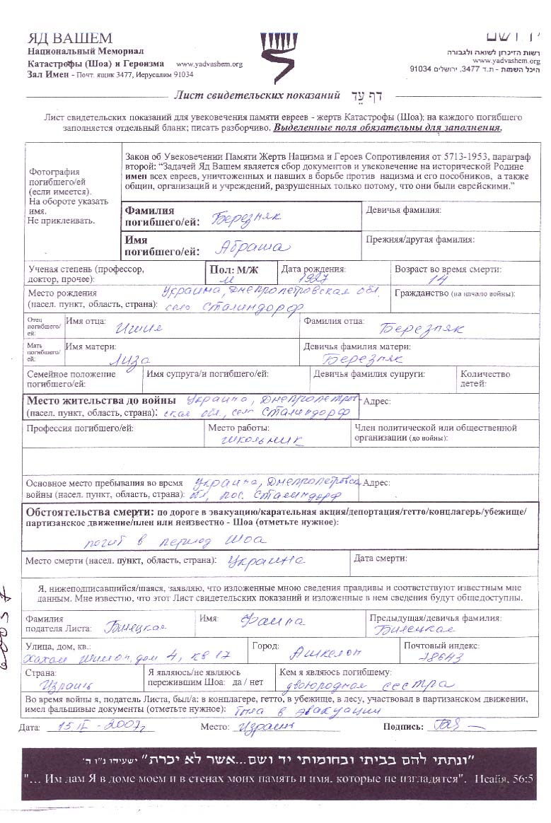 Avrum Bereznyak est né à Novo Vitebsk, Ukraine (URSS) en 1931. Il était Uchashchiysya. Avant la seconde guerre mondiale il vivait à Novo Vitebsk, Ukraine (URSS).