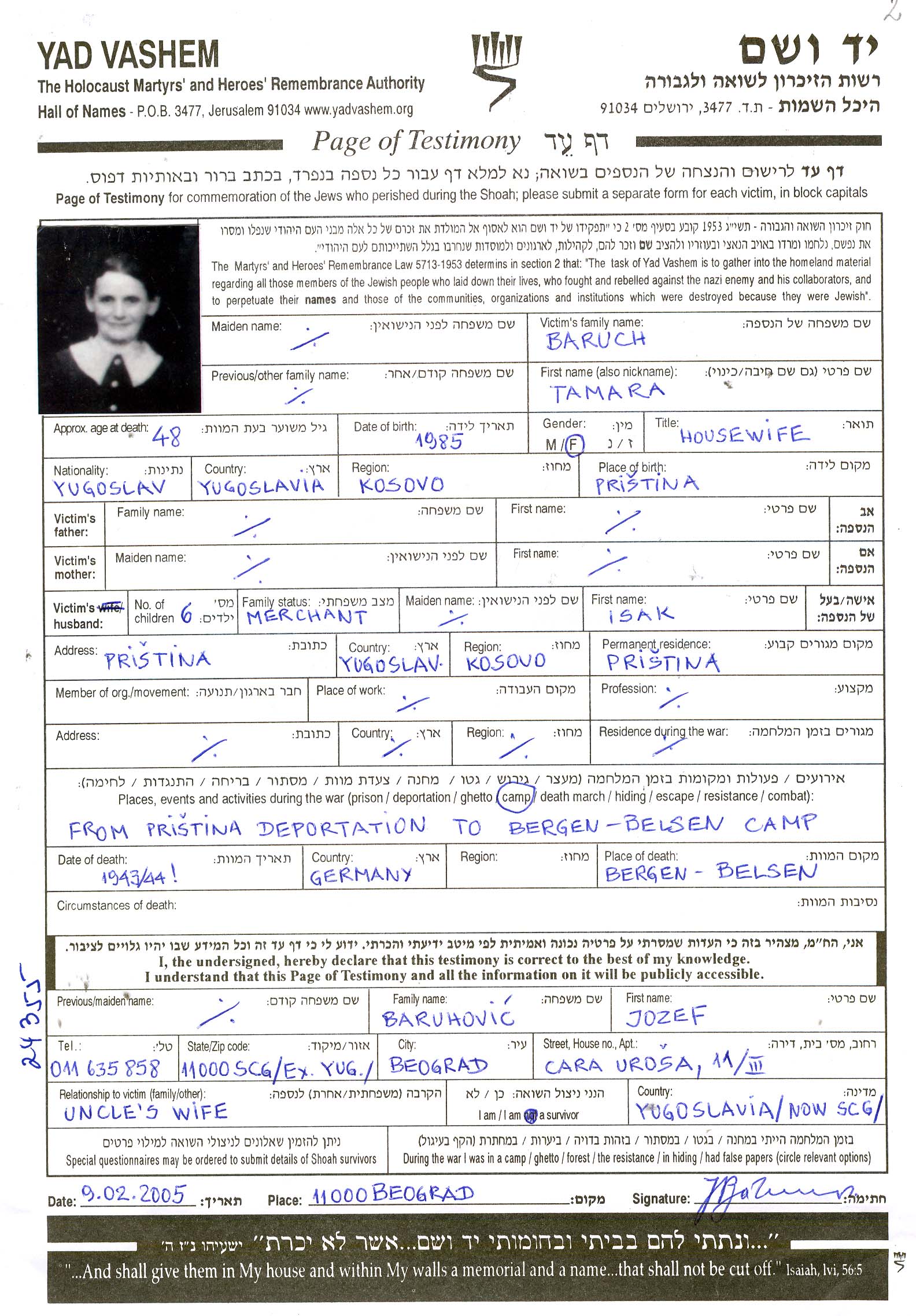 Baruch | Tamara | 1885 | Prishtina, Yugoslavie | Feuille de témoignage |