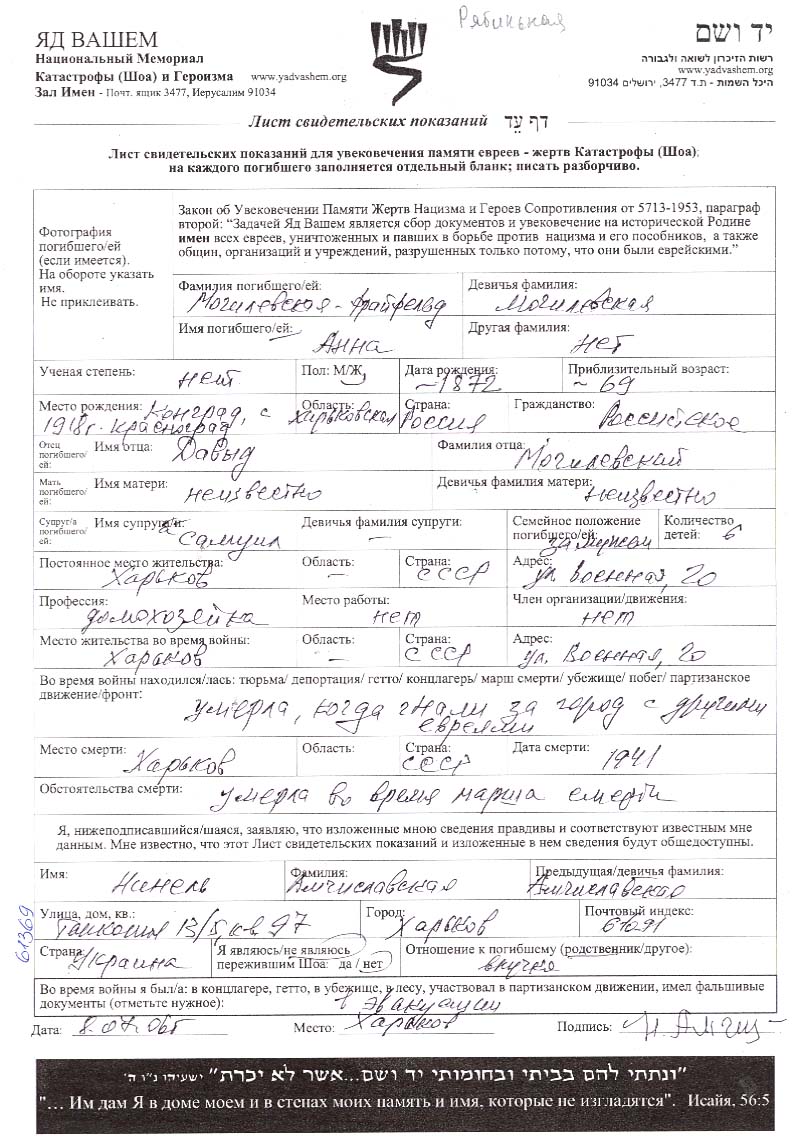 Khana Fraifeld née Mogilevskaya est née à Krasnograd, Ukraine (URSS) en 1870. Elle était Femme au foyer. Avant la seconde guerre mondiale elle vivait à Kharkov, Ukraine (URSS). Khana a été assassinée pendant la Shoah. Lieu de la mort: Kharkov, Ukraine (URSS) en 12/1941.